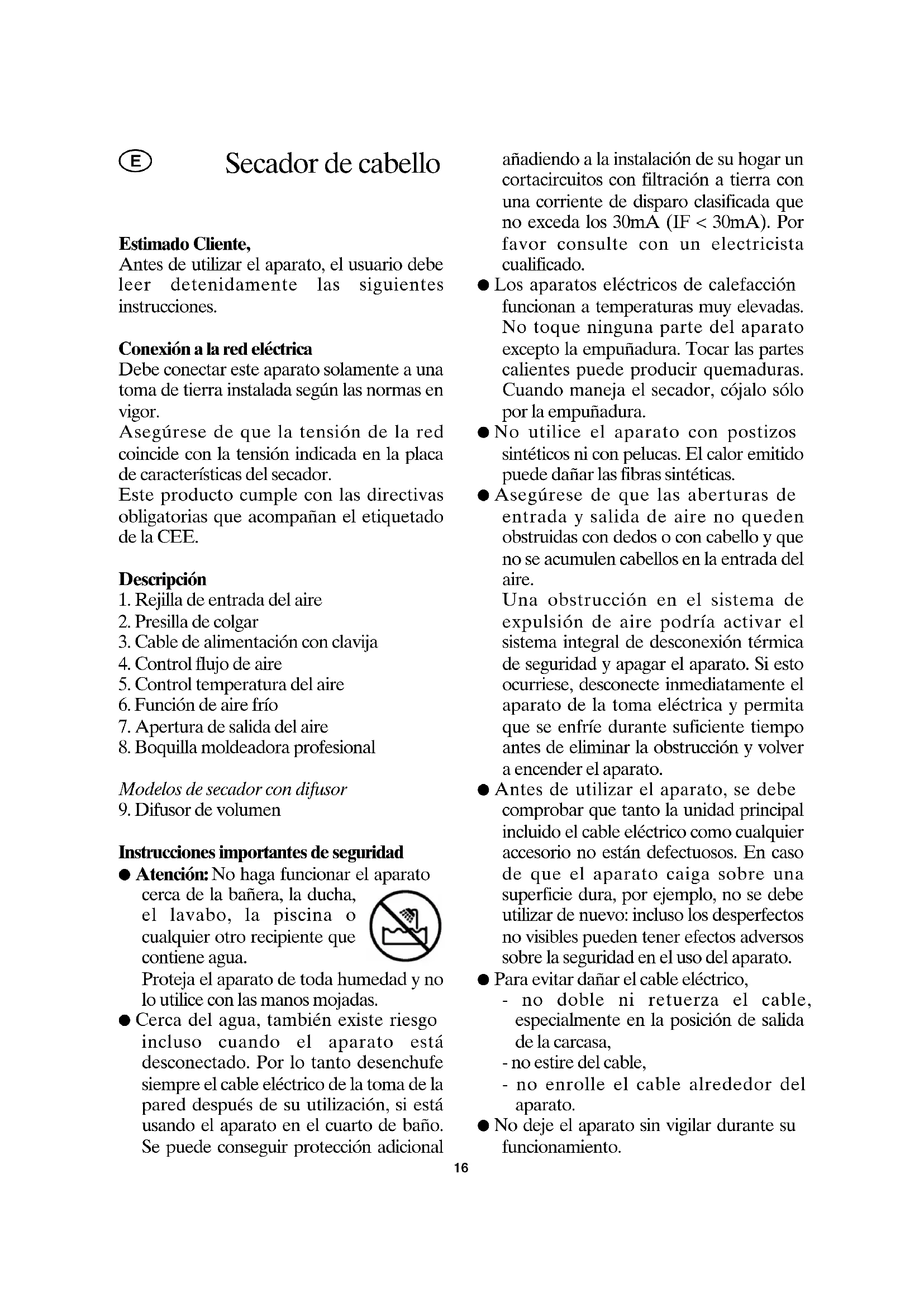 Instrucciones importantes de seguridad ● Atención: No haga funcionar el aparato cerca de la bañera, la ducha, el lavabo, la piscina o cualquier otro recipiente que contiene agua. Proteja el aparato de toda humedad y no lo utilice con las manos mojadas. ● Cerca del agua, también existe riesgo incluso cuando el aparato está desconectado. Por lo tanto desenchufe siempre el cable eléctrico de la toma de la pared después de su utilización, si está usando el aparato en el cuarto de baño. Se puede conseguir protección adicional añadiendo a la instalación de su hogar un cortacircuitos con filtración a tierra con una corriente de disparo clasificada que no exceda los 30mA (IF < 30mA). Por favor consulte con un electricista cualificado. ● Los aparatos eléctricos de calefacción funcionan a temperaturas muy elevadas. No toque ninguna parte del aparato excepto la empuñadura. Tocar las partes calientes puede producir quemaduras. Cuando maneja el secador, cójalo sólo por la empuñadura. ● No utilice el aparato con postizos sintéticos ni con pelucas. El calor emitido puede dañar las fibras sintéticas. ● Asegúrese de que las aberturas de entrada y salida de aire no queden obstruidas con dedos o con cabello y que no se acumulen cabellos en la entrada del aire. Una obstrucción en el sistema de expulsión de aire podría activar el sistema integral de desconexión térmica de seguridad y apagar el aparato. Si esto ocurriese, desconecte inmediatamente el aparato de la toma eléctrica y permita que se enfríe durante suficiente tiempo antes de eliminar la obstrucción y volver a encender el aparato. ● Antes de utilizar el aparato, se debe comprobar que tanto la unidad principal incluido el cable eléctrico como cualquier accesorio no están defectuosos. En caso de que el aparato caiga sobre una superficie dura, por ejemplo, no se debe utilizar de nuevo: incluso los desperfectos no visibles pueden tener efectos adversos sobre la seguridad en el uso del aparato. ● Para evitar dañar el cable eléctrico, - no doble ni retuerza el cable, especialmente en la posición de salida de la carcasa, - no estire del cable, - no enrolle el cable alrededor del aparato. ● No deje el aparato sin vigilar durante su funcionamiento.