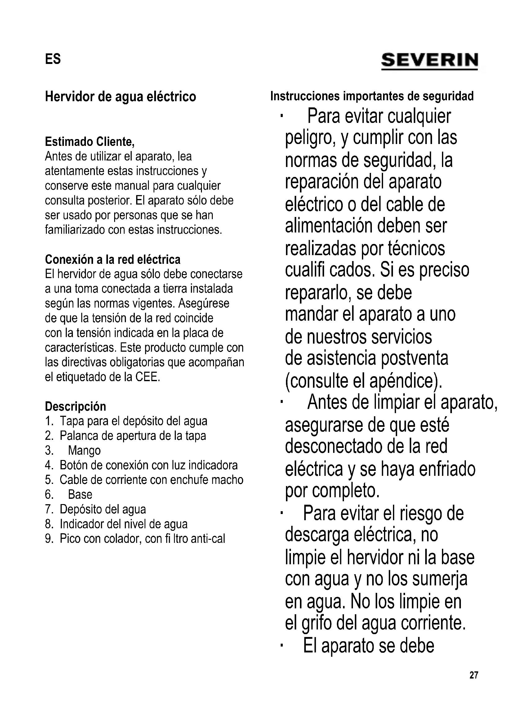 Instrucciones importantes de seguridad ∙ Para evitar cualquier peligro, y cumplir con las normas de seguridad, la reparación del aparato eléctrico o del cable de alimentación deben ser realizadas por técnicos cualifi cados. Si es preciso repararlo, se debe mandar el aparato a uno de nuestros servicios de asistencia postventa (consulte el apéndice). ∙ Antes de limpiar el aparato, asegurarse de que esté desconectado de la red eléctrica y se haya enfriado por completo. ∙ Para evitar el riesgo de descarga eléctrica, no limpie el hervidor ni la base con agua y no los sumerja en agua. No los limpie en el grifo del agua corriente. ∙ El aparato se debe ES28 descalcifi car con regularidad. Limpie el depósito de agua con un paño húmedo, cuando sea necesario. ∙ Se incluye información detallada sobre la limpieza del aparato en la sección Limpieza y mantenimiento. ∙ Este aparato podrá ser utilizado por niños (mayores de 8 años) y personas con reducidas facultades físicas, sensoriales o mentales, o sin experiencia ni conocimiento del producto, siempre que hayan recibido la supervisión o instrucciones referentes al uso del aparato y entiendan por completo el peligro y las precauciones de seguridad. ∙ Los niños no deben jugar con el aparato. ∙ No se debe permitir que los niños realicen ningún trabajo de limpieza o mantenimiento del aparato a menos que esté bajo vigilancia y tengan más de 8 años. ∙ El aparato y su cable eléctrico siempre se deben mantener fuera del alcance de niños menores de 8 años. ∙ Este aparato ha sido diseñado para el uso doméstico u otra aplicación similar, por ejemplo - en cocinas de personal, en ofi cinas y otros puntos comerciales, - en empresas agrícolas, - por los clientes de hoteles, pensiones, etc. y alojamientos similares, - en casas rurales. ∙ Las superfi cies exteriores se calientan durante el uso29 y se mantendrán calientes durante cierto tiempo. ∙ No deje el hervidor de agua desatendido cuando lo esté utilizando. Utilice solo agua pura para llenar el depósito hasta el nivel deseado, respetando las señales de nivel Min. (0.5 l) y Max. (1.0 l) del indicador. Si sobrepasa la capacidad del depósito puede haber peligro de que el agua salga al hervir. ∙ Tenga también cuidado de no quemarse con el vapor muy caliente generado. Por ello, no debe tocar ninguna pieza del aparato excepto el asa durante su utilización. ∙ Cuidado: Durante el proceso de ebullición del agua y cuando sirva el agua caliente, debe mantener la tapa cerrada en todo momento. ∙ El hervidor sólo puede usarse con la base suministrada. ∙ No separe nunca el recipiente de agua de la base (o vuelva a colocarlo) mientras el aparato está encendido. ∙ Si el recipiente de agua no está en su base, asegúrese de que no resbalará sobre cualquier superfi cie lisa. ∙ Las conexiones eléctricas de la base se deben proteger siempre para evitar su contacto con agua. ∙ Precaución: El uso incorrecto puede provocar lesiones personales graves. ∙ Precaución: Mantenga a los niños alejados del material de embalaje, porque podría ser peligroso, existe el peligro de asfi xia. ∙ Antes de utilizar el aparato, siempre se debe comprobar que tanto la unidad30 principal, el cable de alimentación como cualquier accesorio no están defectuosos. En caso de que el aparato haya caído sobre una superfi cie dura, o se haya tirado en exceso del cable de alimentación, no se deberá utilizar de nuevo: incluso los desperfectos no visibles pueden tener efectos adversos sobre la seguridad en el uso del aparato. ∙ El aparato sólo se debe utilizar sobre una superfi cie nivelada, resistente al calor. ∙ No ponga el aparato en funcionamiento debajo de un armario empotrado u objeto similar; el vapor emitido podría quedar acumulado debajo del armario. ∙ No deje que la carcasa ni el cable entren en contacto con llamas ni con ninguna superfi cie caliente tales como platos muy calientes. ∙ No deje que el cable de la corriente cuelgue suelto y manténgalo bien alejado de las partes calientes de la carcasa. ∙ Tenga mucho cuidado cuando transporte el recipiente con agua caliente en su interior. ∙ Desenchufe siempre el hervidor - después del uso, - si hay una avería y, - antes de limpiarlo. Utilización correcta ∙ Este aparato ha sido diseñado exclusivamente para calentar agua limpia y fresca. Cualquier otra utilización debe ser considerada inapropiada y puede provocar lesiones personales o daños materiales. ∙ No es adecuado para calentar leche, té u otros alimentos y bebidas. Desconexión térmica de seguridad El dispositivo de desconexión térmica de seguridad evita el sobrecalentamiento de la resistencia, en caso de que el aparato se encienda accidentalmente sin agua, o la resistencia térmica esté calcifi cada. Una vez que la desconexión de seguridad haya apagado el hervidor, se deberá dejar que el hervidor se enfríe sufi ciente, o se deberá descalcifi car antes de enchufarlo de nuevo. Antes de usarlo por primera vez Para garantizar la limpieza total, hierva y tire el agua hervida por primera vez. Para hervir agua ∙ Retire el depósito del agua de su base. ∙ Pulse la palanca de apertura en el mango para abrir la tapa, y llene el depósito de agua hasta el nivel deseado, respetando las señales de nivel Mín (0.5 l) y Máx (1.0 l). ∙ Cierre la tapa y vuelva a colocar el recipiente sobre la base. ∙ Enchúfelo en una toma de pared apropiada y pulse el botón de conexión. Se enciende la luz indicadora. ∙ Empieza el proceso de ebullición.31 Una vez que ha llegado al punto de ebullición, el aparato se apaga automáticamente con el dispositivo de corte de corriente de vapor integrado. La luz indicadora se apaga. ∙ Si quiere interrumpir el proceso de ebullición, apague el aparato con el botón de conexión. ∙ Para servir el agua, retire el depósito de su base. ∙ Para evitar la emisión de vapor, asegúrese de que la tapa está bien
