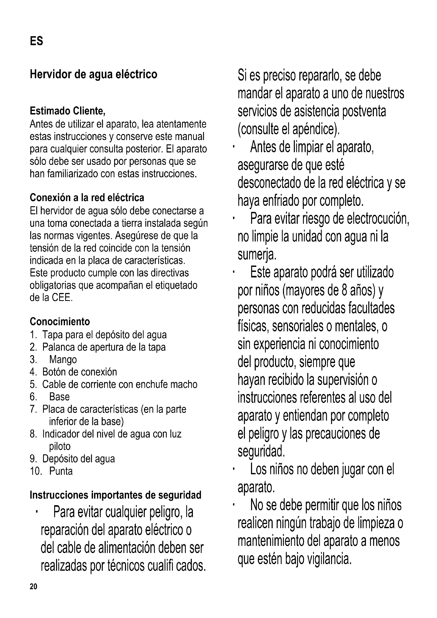 Instrucciones importantes de seguridad ∙ Para evitar cualquier peligro, la reparación del aparato eléctrico o del cable de alimentación deben ser realizadas por técnicos cualifi cados. Si es preciso repararlo, se debe mandar el aparato a uno de nuestros servicios de asistencia postventa (consulte el apéndice). ∙ Antes de limpiar el aparato, asegurarse de que esté desconectado de la red eléctrica y se haya enfriado por completo. ∙ Para evitar riesgo de electrocución, no limpie la unidad con agua ni la sumerja. ∙ Este aparato podrá ser utilizado por niños (mayores de 8 años) y personas con reducidas facultades físicas, sensoriales o mentales, o sin experiencia ni conocimiento del producto, siempre que hayan recibido la supervisión o instrucciones referentes al uso del aparato y entiendan por completo el peligro y las precauciones de seguridad. ∙ Los niños no deben jugar con el aparato. ∙ No se debe permitir que los niños realicen ningún trabajo de limpieza o mantenimiento del aparato a menos que estén bajo vigilancia. ES21 ∙ El aparato y su cable eléctrico siempre se deben mantener fuera del alcance de niños menores de 8 años. ∙ Este aparato ha sido diseñado para el uso doméstico u otra aplicación similar, por ejemplo - en ofi cinas y otros puntos comerciales, - en empresas agrícolas, - por los clientes de hoteles, pensiones, etc. y establecimientos similares, - en casas rurales. ∙ No deje el hervidor de agua desatendido cuando lo esté utilizando. Use siempre agua pura y al llenarlo de agua tenga siempre en cuenta las marcas de los niveles máximo y mínimo del agua. Si sobrepasa la capacidad del depósito puede haber peligro de que el agua salga al hervir. ∙ Tenga también cuidado de no quemarse con el vapor muy caliente generado. Por ello, no debe tocar ninguna pieza del aparato excepto el asa durante su utilización. ∙ ¡ Cuidado! Durante el proceso de ebullición del agua y cuando sirva el agua caliente, debe mantener la tapa cerrada en todo momento. ∙ El hervidor sólo puede usarse con la base suministrada. ∙ No separe nunca el recipiente de agua de la base (o vuelva a colocarlo) mientras el aparato está encendido. ∙ Precaución: mantenga a los niños alejados del material de embalaje, porque podría ser peligroso, existe el peligro de asfi xia. ∙ Antes de utilizar el aparato, siempre se debe comprobar que tanto la unidad principal, el cable de alimentación como cualquier accesorio no están defectuosos. En caso de que el aparato haya caído sobre una superfi cie dura, o se haya tirado en exceso del cable de alimentación, no se deberá utilizar de nuevo: incluso los desperfectos no visibles pueden tener efectos adversos sobre la seguridad en el uso del aparato. ∙ El aparato sólo se debe utilizar sobre una superfi cie nivelada, resistente al calor. ∙ No ponga el aparato en funcionamiento debajo de un armario empotrado u objeto similar; el vapor emitido podría quedar acumulado debajo del armario. ∙ Las superfi cies exteriores se calientan durante el uso y se mantendrán calientes durante cierto tiempo. ∙ No deje que la carcasa ni el cable entren en contacto con llamas ni con ninguna superfi cie caliente tales como platos muy22 calientes. ∙ No deje que el cable de la corriente cuelgue suelto y manténgalo bien alejado de las partes calientes de la carcasa. ∙ Desenchufe siempre el hervidor - después del uso, - si hay una avería y, - antes de limpiarlo. ∙ No se acepta responsabilidad alguna si hay averías a consecuencia del uso incorrecto del aparato o si estas instrucciones no han sido observadas debidamente. Desconexión térmica de seguridad La previa conexión del dispositivo de desconexión térmica de seguridad evita el excesivo calentamiento la resistencia cuando por error se encienda la unidad sin agua, o si la resistencia estuviera calcifi cada. Una vez que la desconexión de seguridad haya apagado el hervidor, se deberá dejar que el hervidor se enfríe sufi ciente, o se deberá descalcifi car antes de enchufarlo de nuevo. Antes de usarlo por primera vez ∙ Para garantizar la limpieza total, hierva y tire el agua hervida por primera vez. Para hervir agua ∙ Retire el depósito del agua de su base. ∙ Abra la tapadera y llene el recipiente con agua hasta el nivel deseado, observando las señales de nivel máximo y mínimo. ∙ Cierre la tapa y vuelva a colocar el recipiente sobre la base. Enchufe en una toma de corriente adecuada y pulse el interruptor Encender/Apagar; la luz piloto del indicador del nivel de agua se enciende. ∙ Empieza el proceso de ebullición. Una vez que ha llegado al punto de ebullición, el aparato se apaga automáticamente con el dispositivo de corte de corriente de vapor integrado. Se escuchará una señal sonora y la luz piloto se apaga. ∙ Para interrumpir el proceso de ebullición, sitúe el interruptor Encender/Apagar en la posición Apagar. ∙ Para servir el agua, retire el depósito de su base. ∙ Para evitar la emisión de vapor, asegúrese de que la tapa está bien colocada mientras está sirviendo el agua. ∙ Después de usar el aparato desenchufe el cable eléctrico de la toma de pared. ∙ No deje restos de agua en el recipiente. Compartimento para enrollar el cable eléctrico El compartimento para enrollar el cable eléctrico situado en la base permite reducir la longitud del cable eléctrico durante la utilización y facilita el almacenaje del aparato. Descalcifi cación Dependiendo de la calidad del agua en su zona, se puede producir una acumulación de depósitos de cal dentro del recipiente de agua. Se aconseja retirar estos depósitos a intervalos periódicos. La garantía quedará anulada cuando el hervidor no funcione correctamente debido a la no eliminación de los depósitos de cal. Utilice una solución elaborada con 0.5 litros de agua y 40 ml de vinagre concentrado. ∙ Añada la solución descalcifi cadora. ∙ Encienda el aparato y deje que la sol