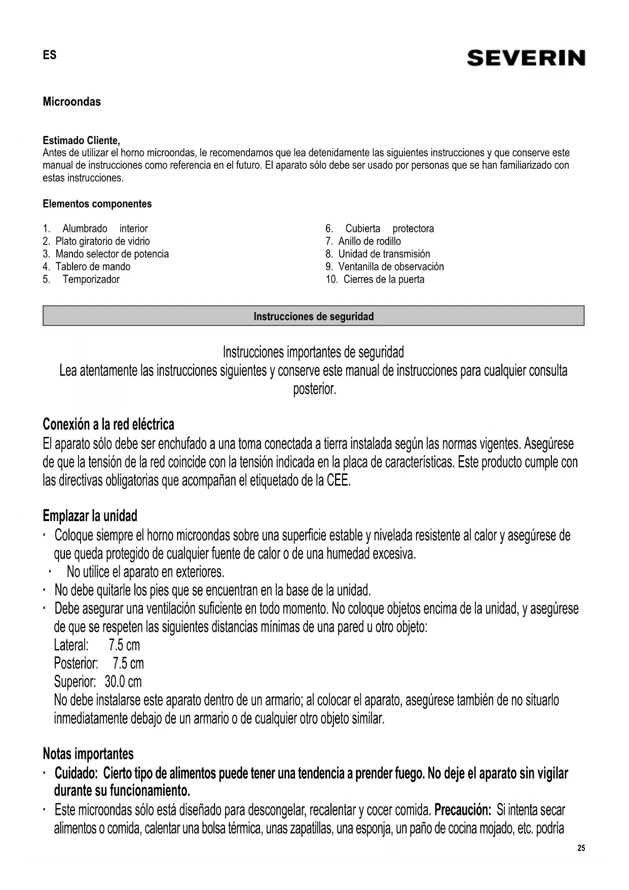 Instrucciones de seguridad Instrucciones importantes de seguridad Lea atentamente las instrucciones siguientes y conserve este manual de instrucciones para cualquier consulta posterior. Conexión a la red eléctrica El aparato sólo debe ser enchufado a una toma conectada a tierra instalada según las normas vigentes. Asegúrese de que la tensión de la red coincide con la tensión indicada en la placa de características. Este producto cumple con las directivas obligatorias que acompañan el etiquetado de la CEE. Emplazar la unidad ∙ Coloque siempre el horno microondas sobre una superfi cie estable y nivelada resistente al calor y asegúrese de que queda protegido de cualquier fuente de calor o de una humedad excesiva. ∙ No utilice el aparato en exteriores. ∙ No debe quitarle los pies que se encuentran en la base de la unidad. ∙ Debe asegurar una ventilación sufi ciente en todo momento. No coloque objetos encima de la unidad, y asegúrese de que se respeten las siguientes distancias mínimas de una pared u otro objeto: Lateral: 7.5 cm Posterior: 7.5 cm Superior: 30.0 cm No debe instalarse este aparato dentro de un armario; al colocar el aparato, asegúrese también de no situarlo inmediatamente debajo de un armario o de cualquier otro objeto similar. Notas importantes ∙ Cuidado: Cierto tipo de alimentos puede tener una tendencia a prender fuego. No deje el aparato sin vigilar durante su funcionamiento. ∙ Este microondas sólo está diseñado para descongelar, recalentar y cocer comida. Precaución: Si intenta secar alimentos o comida, calentar una bolsa térmica, unas zapatillas, una esponja, un paño de cocina mojado, etc. podría26 sufrir lesiones por combustión o incendio. ∙ No se acepta responsabilidad alguna si hay averías a consecuencia del uso incorrecto del aparato o si estas instrucciones no han sido observadas debidamente. ∙ Utilice solo utensilios de menaje adecuados. Puede consultar información más detallada en la sección ‚Emplee siempre utensilios de cocina apropiados‘. ∙ El aparato no debe ser utilizado con un temporizador externo ni un sistema de mando a distancia. ∙ Este aparato podrá ser utilizado por niños (mayores de 8 años) y personas con reducidas facultades físicas, sensoriales o mentales, o sin experiencia ni conocimiento del producto, siempre que hayan recibido la supervisión o instrucciones referentes al uso del aparato y entiendan por completo el peligro y las precauciones de seguridad. ∙ Los niños no deben jugar con el aparato. ∙ No se debe permitir que los niños realicen ningún trabajo de limpieza o mantenimiento del aparato a menos que estén bajo vigilancia. ∙ El aparato y su cable eléctrico siempre se deben mantener fuera del alcance de niños menores de 8 años. ∙ Para evitar riesgo de electrocución, no limpie la unidad con agua ni la sumerja. ∙ Apague y desenchufe siempre el aparato: - antes de la limpieza, - en caso de avería. - después de cada utilización. ∙ Cuando se desenchufa la clavija de la pared, nunca tirar del cable de alimentación. ∙ Atención: Las superfi cies exteriores del electrodoméstico pueden calentarse durante su funcionamiento. También existe peligro de emisión de vapor por las ranuras de ventilación: peligro de quemaduras. ∙ No deje que el aparato o su cable de alimentación entren en contacto con superfi cies calientes o fuentes de calor. No permita que el cable de alimentación cuelgue en el vacío y manténgalo lejos de cosas calientes. ∙ Si el aparato no se mantiene limpio, se producirá el deterioro de su superfi cie, y en consecuencia una disminución en la vida útil del aparato, además de constituir un peligro para la seguridad del usuario. Por este motivo, se debe eliminar inmediatamente cualquier residuo de alimentos. Para tener información detallada sobre la limpieza del aparato, consulte la sección Mantenimiento y limpieza. ∙ Este aparato ha sido diseñado para el uso doméstico u otra aplicación similar, por ejemplo - en cocinas de personal, en ofi cinas y otros puntos comerciales, - en empresas agrícolas, - por los clientes de hoteles, pensiones, etc. y alojamientos similares, - en casas rurales. ∙ Atención: Cualquier trabajo de mantenimiento o reparación que precise la extracción de alguna cubierta protectora contra la radiación del microondas representa un serio peligro para personas no cualifi cadas. Esto incluye la sustitución del cable especial eléctrico o la bombilla del alumbrado interior. El aparato no debe ser abierto, excepto por personal cualifi cado. Si es preciso repararlo, se debe mandar el aparato a uno de nuestros servicios de asistencia postventa. Las direcciones se encuentran en el apéndice de este manual. ∙ Al calentar líquidos en su microondas, el líquido puede calentarse más allá del punto de ebullición sin burbujear visiblemente. Por lo tanto es importante tener muchísimo cuidado al tocar los recipientes, p. ej. al sacarlos del27 horno. El riesgo de sobrecalentamiento se puede reducir al poner una varilla de vidrio termorresistente en el recipiente durante el calentamiento. ∙ Los huevos con su cáscara o huevos enteros cocidos no deberán calentarse en un horno microondas, ya que podrían explotar incluso después de que el proceso de calentamiento en el microondas hubiera concluido. ∙ Atención: Es también sumamente peligroso calentar en el aparato líquidos o cualquier tipo de comida sólida dentro de recipientes cerrados, puesto que existe un riesgo real de explosión. ∙ El contenido de biberones o recipientes de vidrio con comida para niños deben ser revueltos o sacudidos para asegurar que el calor está distribuido de modo uniforme. Para evitar quemaduras dolorosas y peligrosas, controle siempre la temperatura antes de darle de comer al niño. ∙ Al calentar o cocer comida que está envuelta en materiales combustibles como plástico o papel, hay un riesgo de que estos ardan. También es posible q