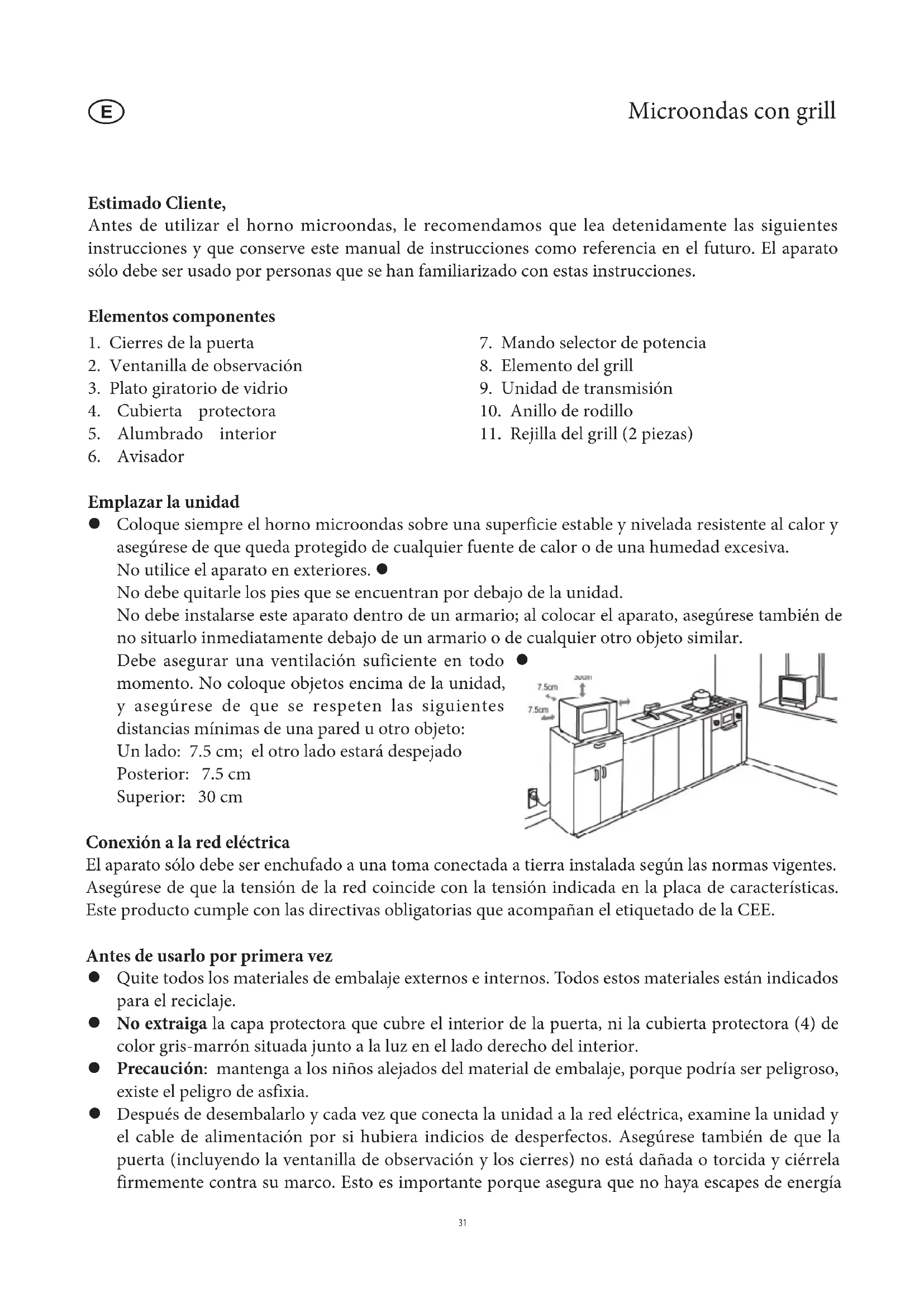 Emplazar la unidad Coloque siempre el horno microondas sobre una superficie estable y nivelada resistente al calor y z asegúrese de que queda protegido de cualquier fuente de calor o de una humedad excesiva. No utilice el aparato en exteriores. z No debe quitarle los pies que se encuentran por debajo de la unidad. No debe instalarse este aparato dentro de un armario; al colocar el aparato, asegúrese también de no situarlo inmediatamente debajo de un armario o de cualquier otro objeto similar. Debe asegurar una ventilación suficiente en todo z momento. No coloque objetos encima de la unidad, y asegúrese de que se respeten las siguientes distancias mínimas de una pared u otro objeto: Un lado: 7.5 cm; el otro lado estará despejado Posterior: 7.5 cm Superior: 30 cm Conexión a la red eléctrica El aparato sólo debe ser enchufado a una toma conectada a tierra instalada según las normas vigentes. Asegúrese de que la tensión de la red coincide con la tensión indicada en la placa de características. Este producto cumple con las directivas obligatorias que acompañan el etiquetado de la CEE. Antes de usarlo por primera vez Quite todos los materiales de embalaje externos e internos. Todos estos materiales están indicados z para el reciclaje. No extraiga z la capa protectora que cubre el interior de la puerta, ni la cubierta protectora (4) de color gris-marrón situada junto a la luz en el lado derecho del interior. Precaución z : mantenga a los niños alejados del material de embalaje, porque podría ser peligroso, existe el peligro de asfixia. Después de desembalarlo y cada vez que conecta la unidad a la red eléctrica, examine la unidad y z el cable de alimentación por si hubiera indicios de desperfectos. Asegúrese también de que la puerta (incluyendo la ventanilla de observación y los cierres) no está dañada o torcida y ciérrela firmemente contra su marco. Esto es importante porque asegura que no haya escapes de energíade microondas durante el funcionamiento. Por la misma razón debe examinar cuidadosamente la caja entera junto con el interior del horno. En caso de avería, este aparato no debe ser usado hasta que haya sido reparado por un técnico cualificado. Antes de utilizar el aparato por vez primera, o tras largos períodos de no utilización, se debe z limpiar meticulosamente como viene indicado en la sección Mantenimiento y Limpieza General. Introducir la unidad de transmisión, el rodillo y el plato giratorio de vidrio en el aparato. z Antes de utilizar el horno microondas, ponga el aparato a calentar en el ajuste grill (sin activar la z función microondas) por unos 10 minutos. Esto eliminará el olor típico que sale de un grill la primera vez que se enciende. Puede que salga un poco de humo; esto es normal, pero asegure una ventilación adecuada. Nota: No encienda el aparato en la función de microondas a menos que la comida a calentar o cocinar haya sido introducida en el horno. La utilización del electrodoméstico vacío podría dañar el aparato. Notas importantes Al calentar líquidos en su microondas, el líquido puede calentarse más allá del punto de z ebullición sin burbujear visiblemente. Por lo tanto es importante tener muchísimo cuidado al tocar los recipientes, p. ej. al sacarlos del horno. El riesgo de sobrecalentamiento se puede reducir al poner una varilla de vidrio termorresistente en el recipiente durante el calentamiento. Los huevos con su cáscara o huevos enteros cocidos no deberán calentarse en un horno z microondas, ya que podrían explotar incluso después de que el proceso de calentamiento en el microondas hubiera concluido. Atención z : Es también sumamente peligroso calentar en el aparato líquidos o cualquier tipo de comida sólida dentro de recipientes cerrados, puesto que existe un riesgo real de explosión. El contenido de biberones o recipientes de vidrio con comida para niños deben ser revueltos o z sacudidos para asegurar que el calor está distribuido de modo uniforme. Para evitar quemaduras dolorosas y peligrosas, controle siempre la temperatura antes de darle de comer al niño. Al calentar o cocer comida que está envuelta en materiales combustibles como plástico o papel, z hay un riesgo de que estos ardan. También es posible que la comida se seque y hasta puede arder si el tiempo de cocción seleccionado es demasiado largo. La grasa y el aceite también son sustancias inflamables. Por lo tanto, es importante controlar el aparato durante su funcionamiento. Por supuesto que los líquidos altamente inflamables como el alcohol concentrado no deben ser calentados. Si constata que está saliendo humo durante el funcionamiento, mantenga la puerta cerrada para z inhibir o apagar las llamas si hay. Apague la unidad inmediatamente y saque el enchufe de la toma de pared. Para evitar el peligro de quemaduras, hay que utilizar un guante para el horno adecuado siempre z que saca comida del horno, dado que los utensilios y recipientes de cocina se calientan, tanto cuando emplea el grill como cuando emplea el microondas. Los termómetros especiales de cocina (como los que se emplean con un horno normal) no son z indicados para el uso con los microondas. Instrucciones importantes de seguridad Cuidado: cierto tipo de alimentos pueden prender fuego con facilidad. No deje el aparato en z funcionamiento sin supervisión. 32Este microondas sólo está diseñado para descongelar, recalentar y cocer comida. No se acepta z responsabilidad alguna si hay averías a consecuencia del uso incorrecto del aparato o si estas instrucciones no han sido observadas debidamente. El aparato no debe ser utilizado con un temporizador externo ni un sistema de mando a z distancia. Este aparato no debe ser utilizado por ninguna persona (incluidos niños) con reducidas z facultades físicas, sensoriales o mentales y tampoco por personas sin experiencia ni conocimiento, a menos que hayan recibido supervisión o instrucciones sobre el uso del aparato por par
