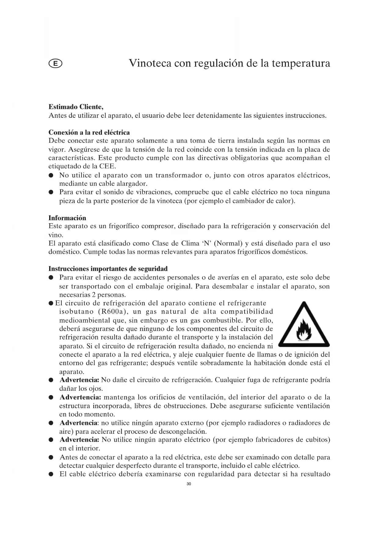 ● Proteja siempre el interior de la vinoteca de cualquier llama o fuente de ignición.