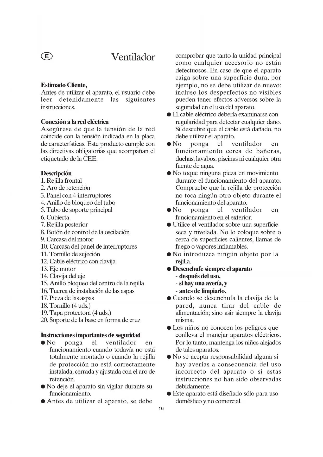 - No ponga el ventilador en funcionamiento cuando todavía no está totalmente montado o cuando la rejilla de protección no está correctamente instalada, cerrada y ajustada con el aro de retención.