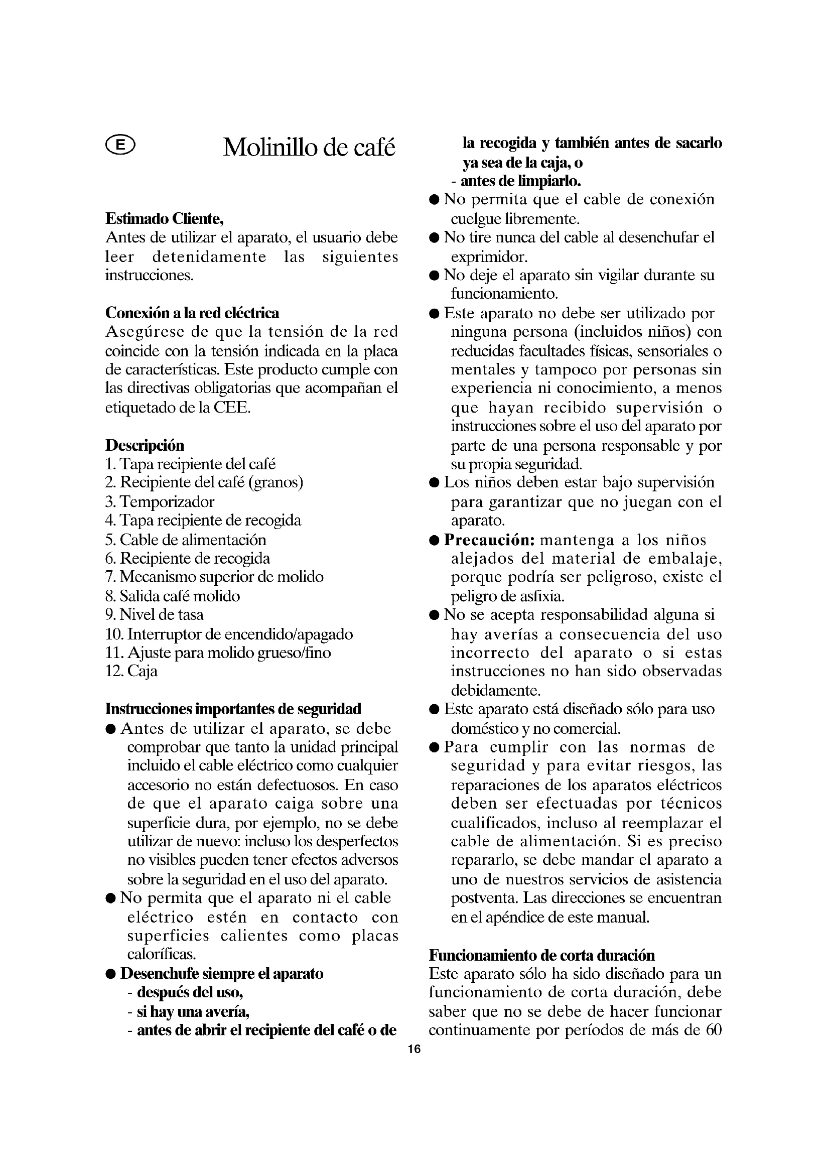 Instrucciones importantes de seguridad ● Antes de utilizar el aparato, se debe comprobar que tanto la unidad principal incluido el cable eléctrico como cualquier accesorio no están defectuosos. En caso de que el aparato caiga sobre una superficie dura, por ejemplo, no se debe utilizar de nuevo: incluso los desperfectos no visibles pueden tener efectos adversos sobre la seguridad en el uso del aparato. ● No permita que el aparato ni el cable eléctrico estén en contacto con superficies calientes como placas caloríficas. ● Desenchufe siempre el aparato - después del uso, - si hay una avería, - antes de abrir el recipiente del café o de la recogida y también antes de sacarlo ya sea de la caja, o - antes de limpiarlo. ● No permita que el cable de conexión cuelgue libremente. ● No tire nunca del cable al desenchufar el exprimidor. ● No deje el aparato sin vigilar durante su funcionamiento. ● Este aparato no debe ser utilizado por ninguna persona (incluidos niños) con reducidas facultades físicas, sensoriales o mentales y tampoco por personas sin experiencia ni conocimiento, a menos que hayan recibido supervisión o instrucciones sobre el uso del aparato por parte de una persona responsable y por su propia seguridad. ● Los niños deben estar bajo supervisión para garantizar que no juegan con el aparato. ● Precaución: mantenga a los niños alejados del material de embalaje, porque podría ser peligroso, existe el peligro de asfixia. ● No se acepta responsabilidad alguna si hay averías a consecuencia del uso incorrecto del aparato o si estas instrucciones no han sido observadas debidamente. ● Este aparato está diseñado sólo para uso doméstico y no comercial. ● Para cumplir con las normas de seguridad y para evitar riesgos, las reparaciones de los aparatos eléctricos deben ser efectuadas por técnicos cualificados, incluso al reemplazar el cable de alimentación. Si es preciso repararlo, se debe mandar el aparato a uno de nuestros servicios de asistencia postventa. Las direcciones se encuentran en el apéndice de este manual. Funcionamiento de corta duración Este aparato sólo ha sido diseñado para un funcionamiento de corta duración, debe saber que no se debe de hacer funcionar continuamente por períodos de más de 60 Molinillo de café