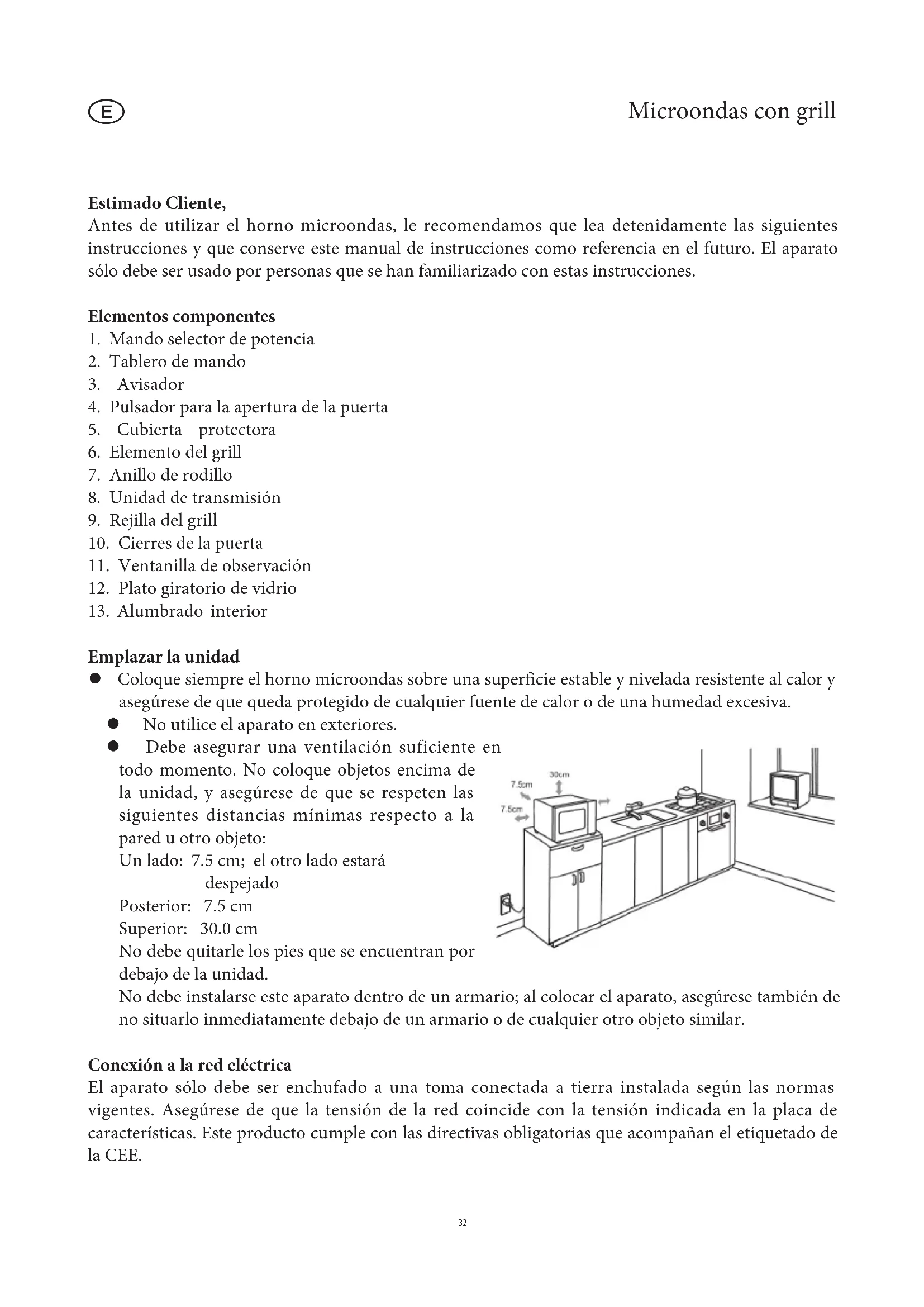 Emplazar la unidad Coloque siempre el horno microondas sobre una superficie estable y nivelada resistente al calor y asegúrese de que queda protegido de cualquier fuente de calor o de una humedad excesiva. No utilice el aparato en exteriores. Debe asegurar una ventilación suficiente en todo momento. No coloque objetos encima de la unidad, y asegúrese de que se respeten las siguientes distancias mínimas respecto a la pared u otro objeto: Un lado: 7.5 cm; el otro lado estará despejado Posterior: 7.5 cm Superior: 30.0 cm No debe quitarle los pies que se encuentran por debajo de la unidad. No debe instalarse este aparato dentro de un armario; al colocar el aparato, asegúrese también de no situarlo inmediatamente debajo de un armario o de cualquier otro objeto similar. Conexión a la red eléctrica El aparato sólo debe ser enchufado a una toma conectada a tierra instalada según las normas vigentes. Asegúrese de que la tensión de la red coincide con la tensión indicada en la placa de características. Este producto cumple con las directivas obligatorias que acompañan el etiquetado de la CEE.