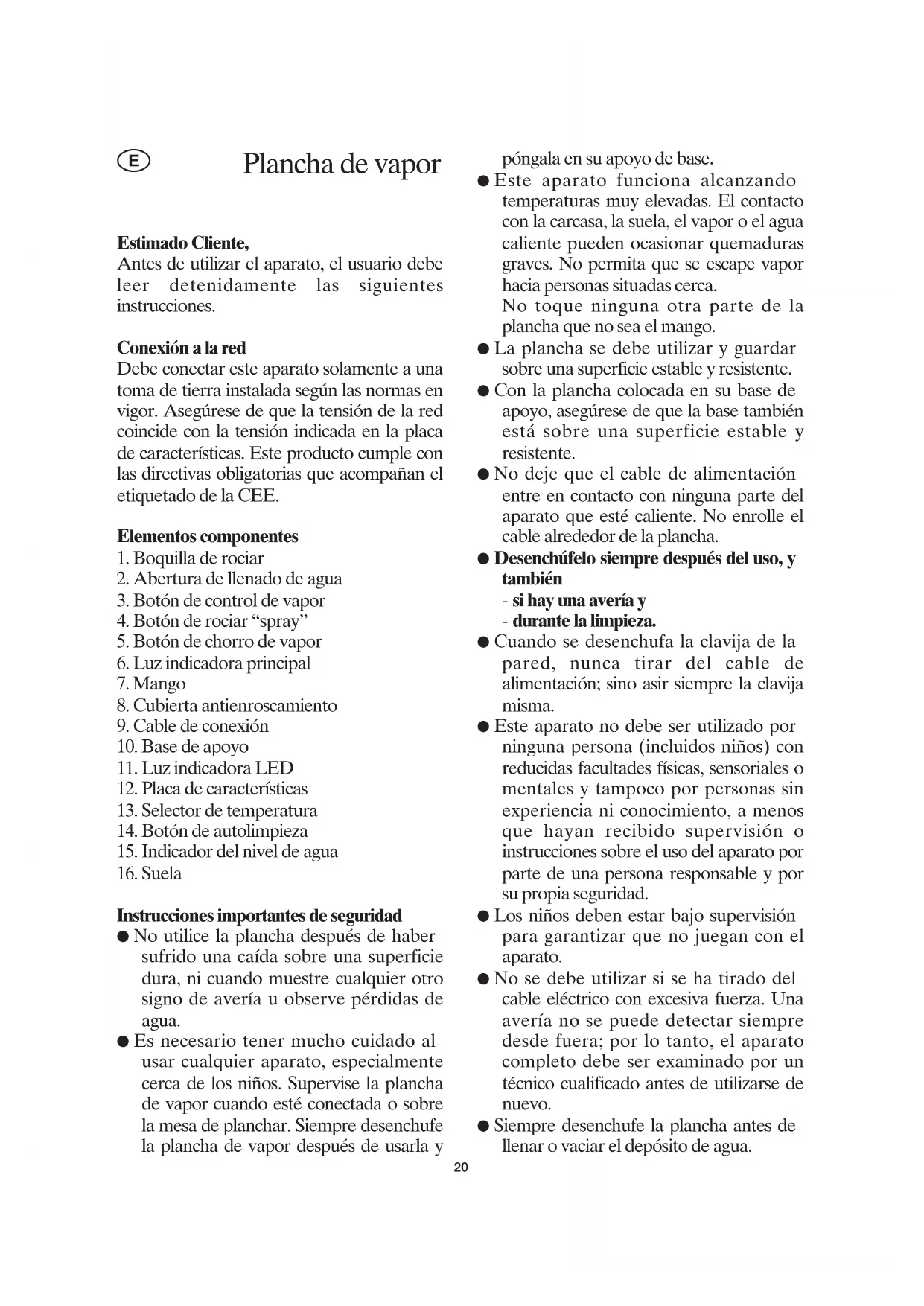 Vacíe el depósito de agua por la abertura de llenado. ● Para evitar daños en la suela, guarde siempre la plancha en posición vertical de forma que descanse sobre la superficie de apoyo de base. Eliminación Los electrodomésticos viejos o defectuosos no se deben tirar en la basura de su hogar, sino que deben desecharse en los puntos públicos de reciclaje y recogida. Garantía Este producto está garantizado por un período de dos años, contado a partir de la fecha de compra, contra cualquier defecto en materiales o mano de obra. Esta garantía sólo es válida si el aparato ha sido utilizado siguiendo las instrucciones de uso, siempre que no haya sido modificado, reparado o manipulado por cualquier persona no autorizada o haya sido estropeado como consecuencia de un uso inadecuado del mismo. Naturalmente esta garantía no cubre las averías debidas a uso o desgaste normales, así como aquellas piezas de fácil rotura tales como cristales, piezas cerámicas, etc. 23Gentile Cliente, Vi preghiamo di leggere attentamente le istruzioni d’uso prima di utilizzare l’apparecchio. Collegamento alla rete L’apparecchio deve esser collegato esclusivamente a una presa di corrente con messa a terra, installata a norma di legge. Assicuratevi che la tensione di alimentazione corrisponda a quella indicata sulla targhetta portadati. Questo prodotto è conforme alle direttive vincolanti per l’etichettatura CE. Descrizione