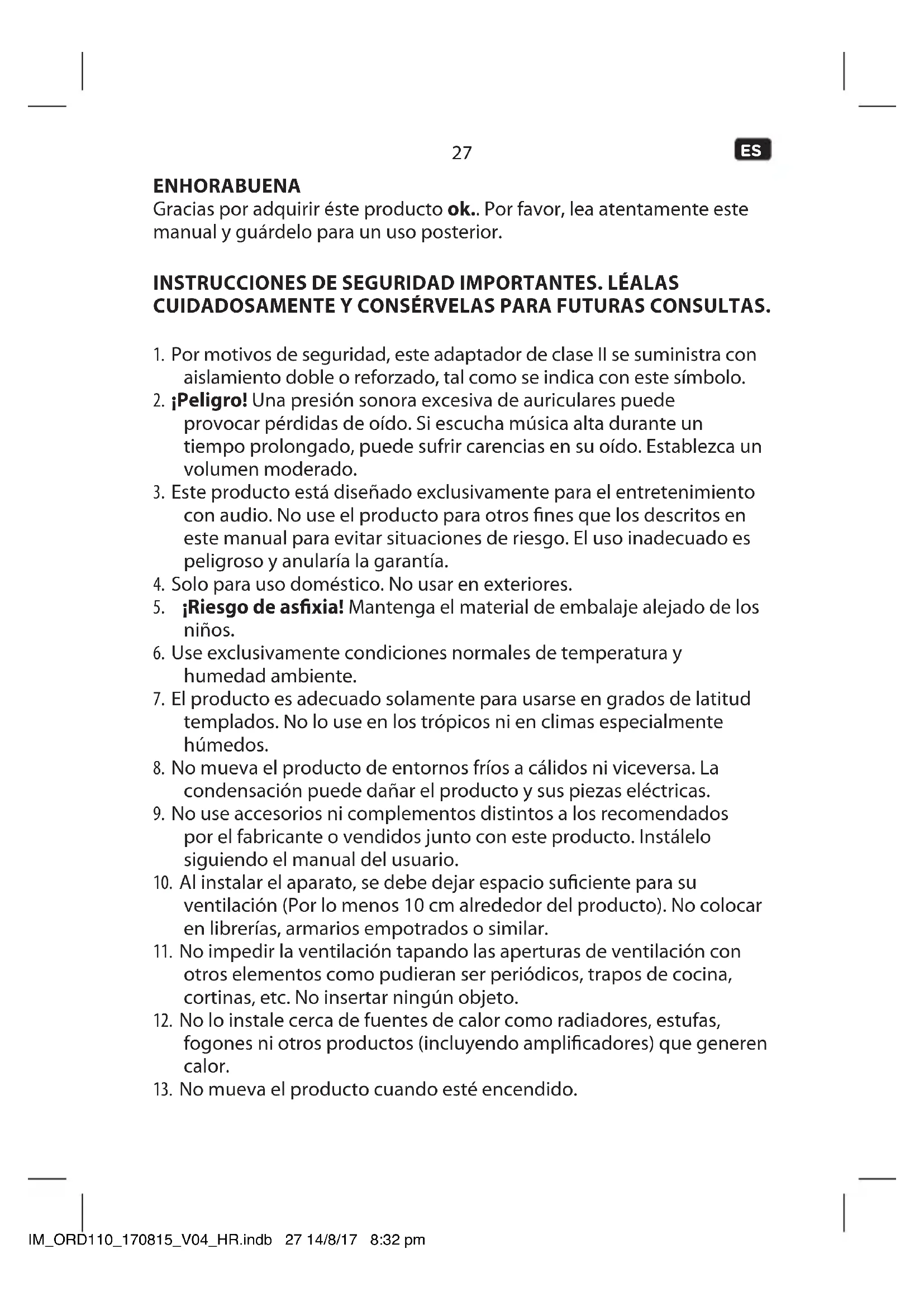 inutilizable desconectando de la toma el enchufe del adaptador corriente y cortando el cable en dos. IM_ORD110_170815_V04_HR.indb 28 14/8/17 8:32 pm29