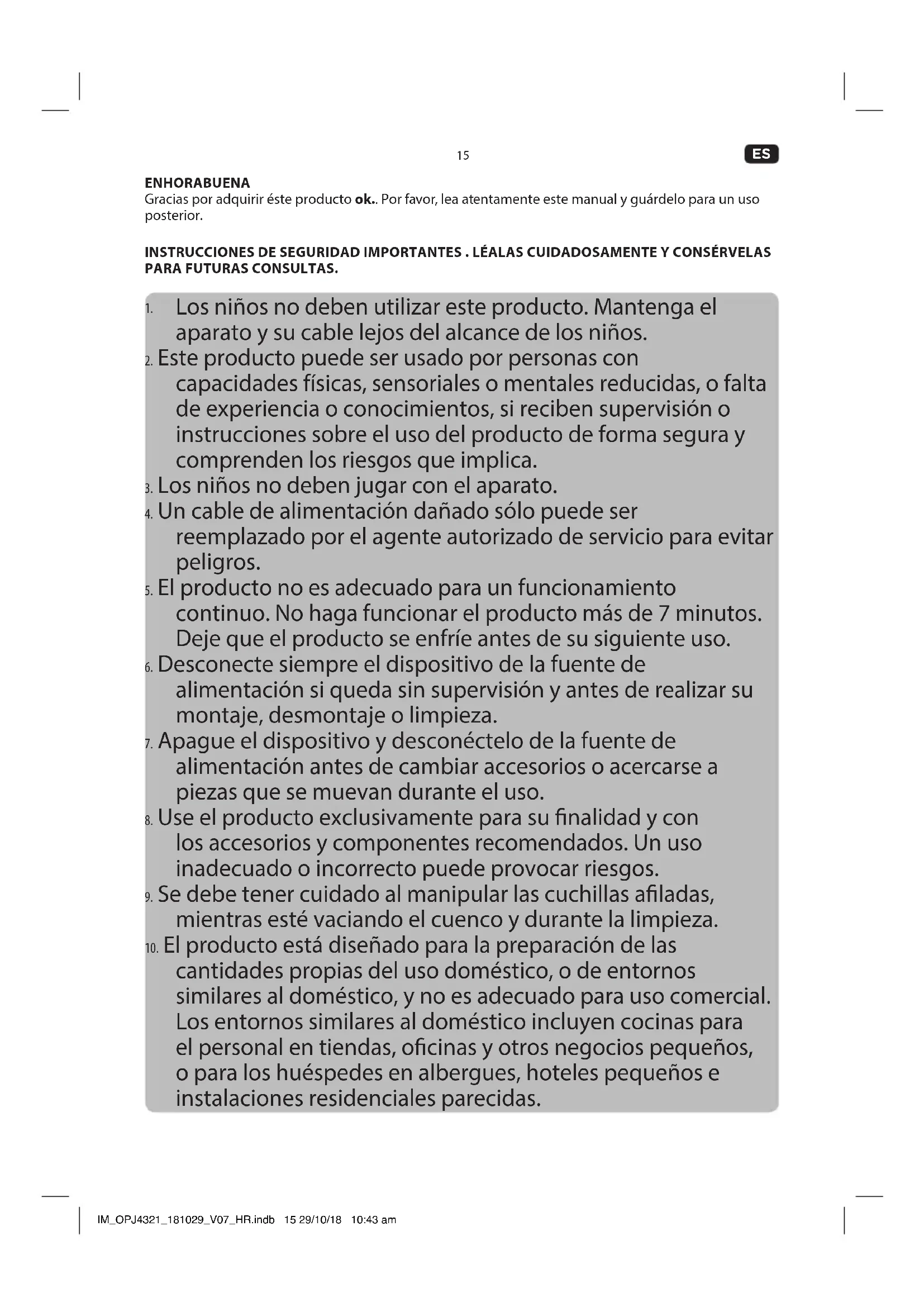 cantidades propias del uso doméstico, o de entornos similares al doméstico, y no es adecuado para uso comercial. Los entornos similares al doméstico incluyen cocinas para el personal en tiendas, ocinas y otros negocios pequeños, o para los huéspedes en albergues, hoteles pequeños e instalaciones residenciales parecidas. IM_OPJ4321_181029_V07_HR.indb 15 29/10/18 10:43 am16 Size = A5