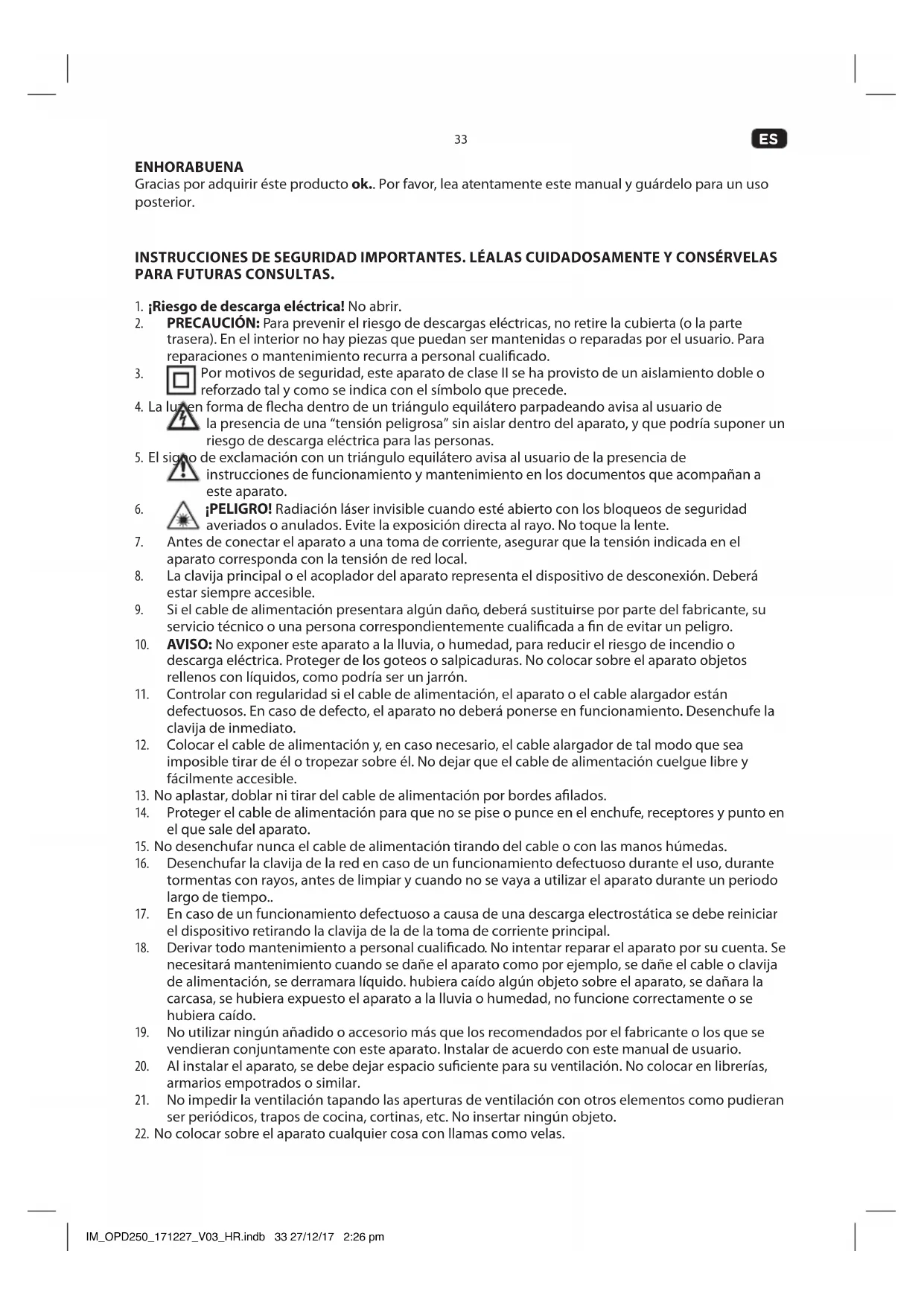 ENHORABUENA Gracias por adquirir éste producto ok.. Por favor, lea atentamente este manual y guárdelo para un uso posterior. INSTRUCCIONES DE SEGURIDAD IMPORTANTES. LÉALAS CUIDADOSAMENTE Y CONSÉRVELAS PARA FUTURAS CONSULTAS.