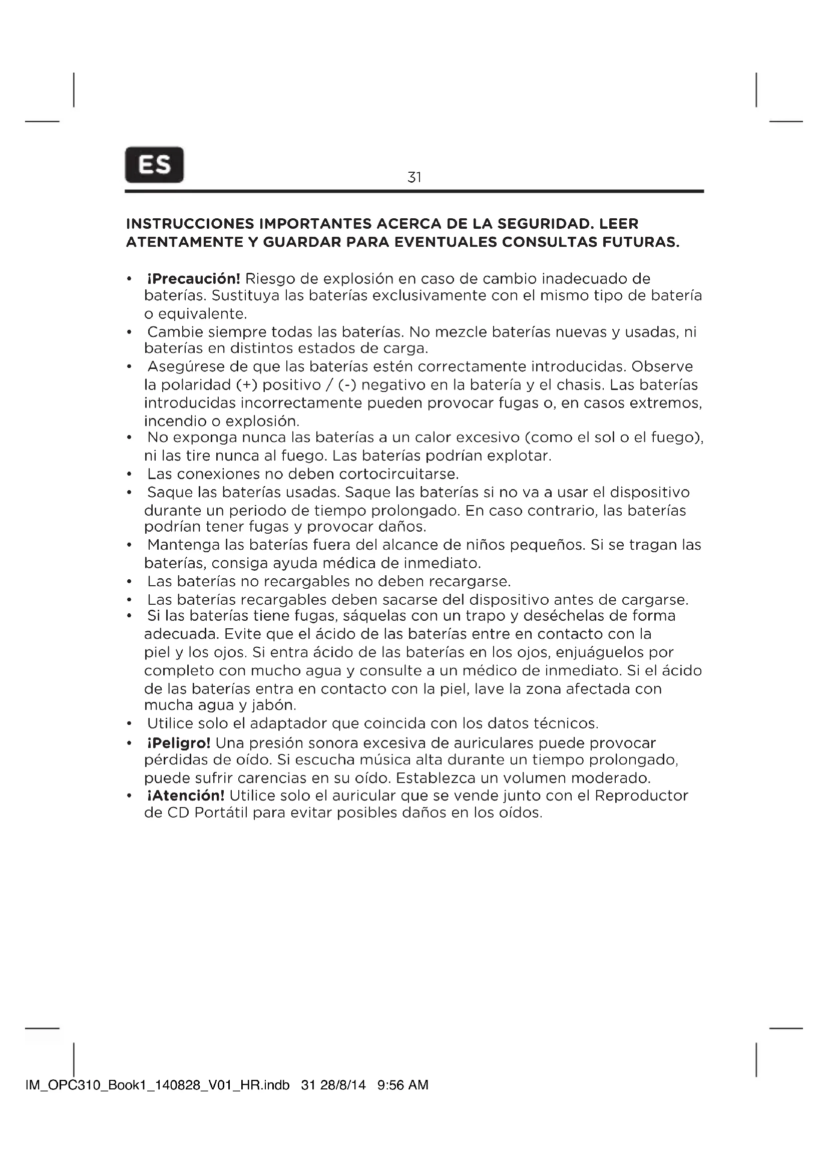 - Guardeelproductoenunlugarsecoyfresco,protegidodelahumedadyla luzdelsoldirecta.Mantengaesteproductofueradelalcancedelosniños. IM_OPC310_Book1_140828_V01_HR.indb 38 28/8/14 9:56 AM39 ESPECIFICACIONES Funcionaconbatería:3V 2xAA(noincluida)/ Potencianominaldeentrada:4,5V ,600mA/ adaptadorexterno(noincluido)deSalida:4,5V ,600mA/ Tensiónmáximadesalida≤150mV/Voltajecaracterísticobandaancha≥75mV ELIMINACIÓN Nodesecheesteaparatocomoresiduodomésticoconvencional. Devuélvaloaunpuntoderecogidaderecicladodepiezaseléctricasy electrónicasWEEE.Conelloayudaráapreservarlosrecursosnaturales yaprotegerelmedioambiente.Contactarconsuvendedorolas autoridadeslocalesparaobtenermásinformación. IM_OPC310_Book1_140828_V01_HR.indb 39 28/8/14 9:56 AM40 IMPORTANT ! CONSIGNES DE SECURITE A LIRE ATTENTIVEMENT ET A CONSERVER AFIN DE VOUS Y REFERER ULTERIEUREMENT.
