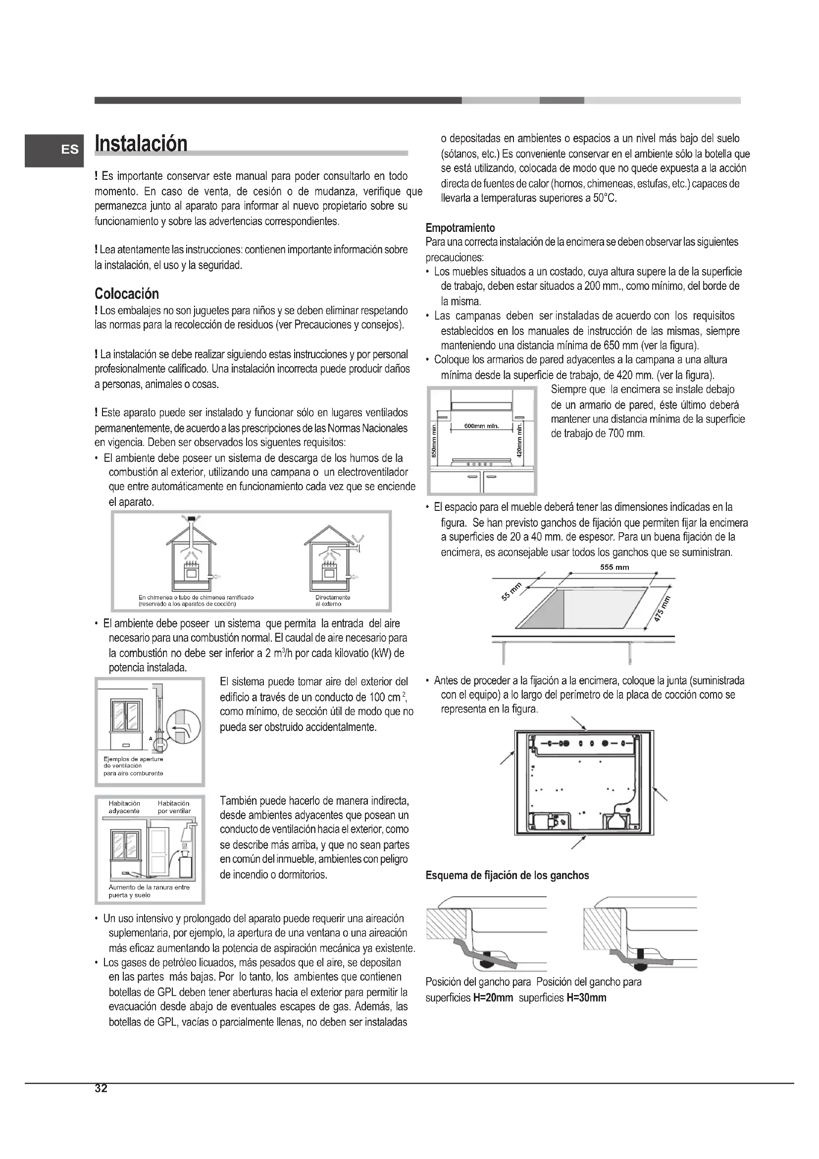 Ejemplos de aperture de ventilaciónpara aire comburenteAumento de la ranura entrepuerta y sueloHabitaciónadyacenteHabitación por ventilar o depositadas en ambientes o espacios a un nivel más bajo del suelo (sótanos, etc.) Es conveniente conservar en el ambiente sólo la botella que se está utilizando, colocada de modo que no quede expuesta a la acción directa de fuentes de calor (hornos, chimeneas, estufas, etc.) capaces de llevarla a temperaturas superiores a 50°C. Empotramiento Para una correcta instalación de la encimera se deben observar las siguientes precauciones: