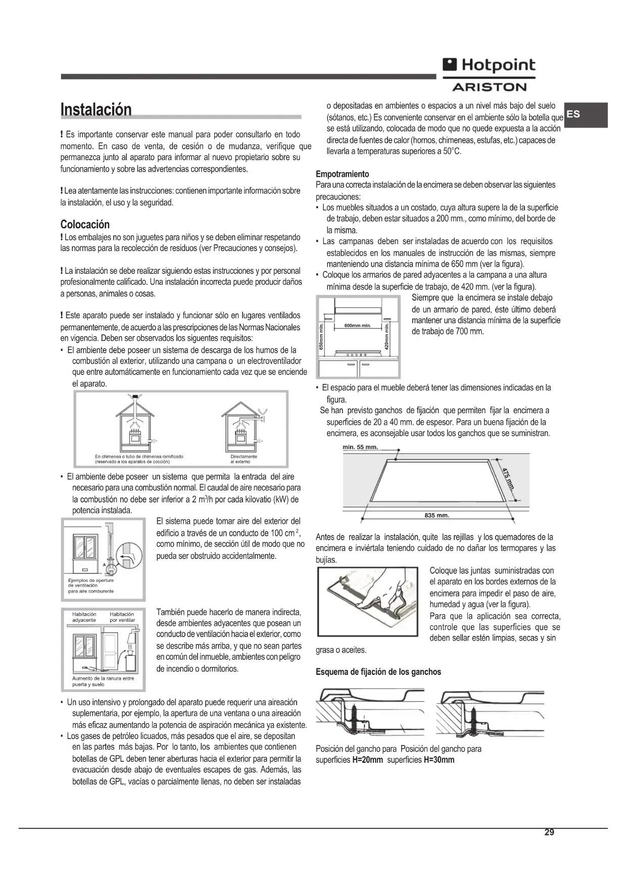 Instalación ! Es importante conservar este manual para poder consultarlo en todo momento. En caso de venta, de cesión o de mudanza, verifique que permanezca junto al aparato para informar al nuevo propietario sobre su funcionamiento y sobre las advertencias correspondientes. ! Lea atentamente las instrucciones: contienen importante información sobre la instalación, el uso y la seguridad. Colocación ! Los embalajes no son juguetes para niños y se deben eliminar respetando las normas para la recolección de residuos (ver Precauciones y consejos). ! La instalación se debe realizar siguiendo estas instrucciones y por personal profesionalmente calicado. Una instalación incorrecta puede producir daños a personas, animales o cosas. ! Este aparato puede ser instalado y funcionar sólo en lugares ventilados permanentemente, de acuerdo a las prescripciones de las Normas Nacionales en vigencia. Deben ser observados los siguentes requisitos: