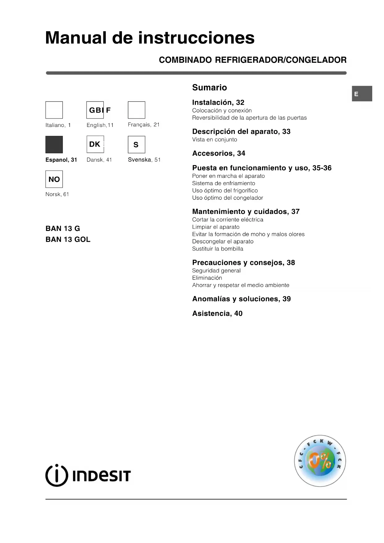 Sumario Instalación, 32 Colocación y conexión Reversibilidad de la apertura de las puertas Descripción del aparato, 33 Vista en conjunto Accesorios, 34 Puesta en funcionamiento y uso, 35-36 Poner en marcha el aparato Sistema de enfriamiento Uso óptimo del frigorífico Uso óptimo del congelador Mantenimiento y cuidados, 37 Cortar la corriente eléctrica Limpiar el aparato Evitar la formación de moho y malos olores Descongelar el aparato Sustituir la bombilla Precauciones y consejos, 38 Seguridad general Eliminación Ahorrar y respetar el medio ambiente Anomalías y soluciones, 39 Asistencia, 40 Manual de instrucciones BAN 13 G BAN 13 GOL Italiano, 1Français, 21English,11 GBI F Dansk , 41 Espanol, 31 DKE Svenska, 51