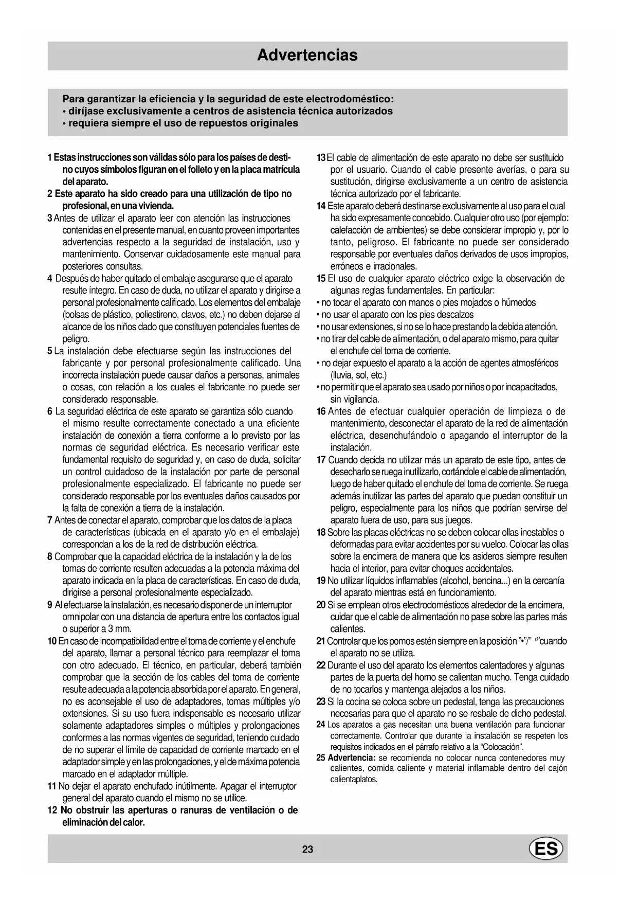 ”cuando el aparato no se utiliza. 22 Durante el uso del aparato los elementos calentadores y algunas partes de la puerta del horno se calientan mucho. Tenga cuidado de no tocarlos y mantenga alejados a los niños. 23 Si la cocina se coloca sobre un pedestal, tenga las precauciones necesarias para que el aparato no se resbale de dicho pedestal. 24 Los aparatos a gas necesitan una buena ventilación para funcionar correctamente. Controlar que durante la instalación se respeten los requisitos indicados en el párrafo relativo a la “Colocación”. 25 Advertencia: se recomienda no colocar nunca contenedores muy calientes, comida caliente y material inflamable dentro del cajón calientaplatos. Para garantizar la eficiencia y la seguridad de este electrodoméstico: