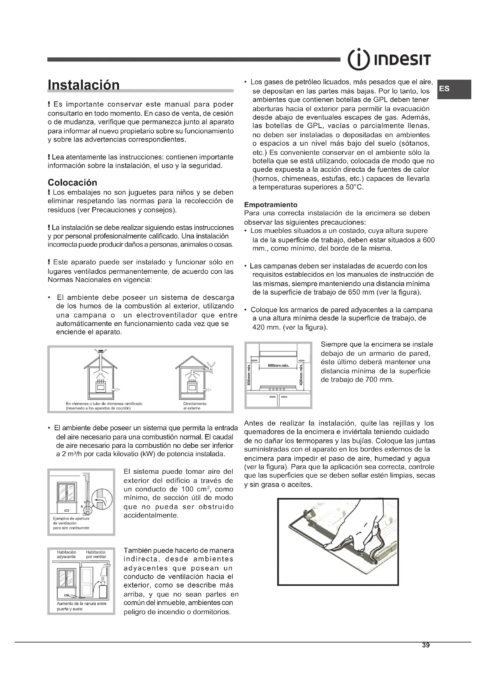 Instalación ! Es importante conservar este manual para poder consultarlo en todo momento. En caso de venta, de cesión o de mudanza, verique que permanezca junto al aparato para informar al nuevo propietario sobre su funcionamiento y sobre las advertencias correspondientes. ! Lea atentamente las instrucciones: contienen importante información sobre la instalación, el uso y la seguridad. Colocación ! Los embalajes no son juguetes para niños y se deben eliminar respetando las normas para la recolección de residuos (ver Precauciones y consejos). ! La instalación se debe realizar siguiendo estas instrucciones y por personal profesionalmente calicado. Una instalación incorrecta puede producir daños a personas, animales o cosas. ! Este aparato puede ser instalado y funcionar sólo en lugares ventilados permanentemente, de acuerdo con las Normas Nacionales en vigencia: