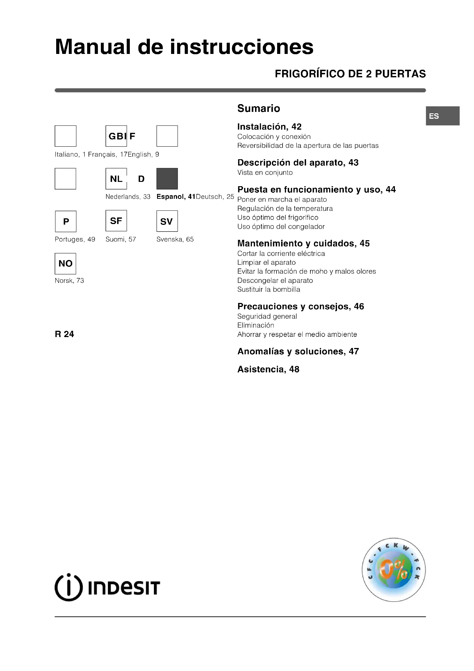 Sumario Instalación, 42 Colocación y conexión Reversibilidad de la apertura de las puertas Descripción del aparato, 43 Vista en conjunto Puesta en funcionamiento y uso, 44 Poner en marcha el aparato Regulación de la temperatura Uso óptimo del frigorífico Uso óptimo del congelador Mantenimiento y cuidados, 45 Cortar la corriente eléctrica Limpiar el aparato Evitar la formación de moho y malos olores Descongelar el aparato Sustituir la bombilla Precauciones y consejos, 46 Seguridad general Eliminación Ahorrar y respetar el medio ambiente Anomalías y soluciones, 47 Asistencia, 48 Manual de instrucciones R 24 Italiano, 1 Français, 17English, 9 GBI F Nederlands, 33Espanol, 41Deutsch, 25 NL ESD Portuges, 49 Suomi, 57 Svenska, 65