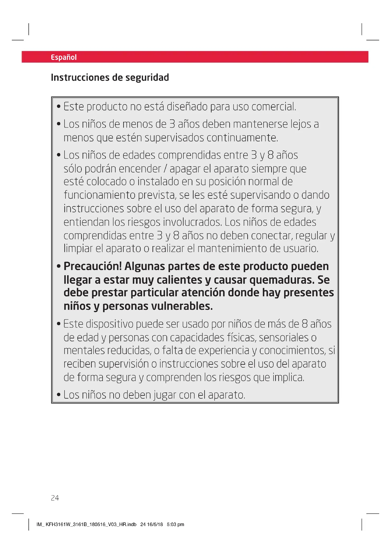 - Los niños no deben jugar con el aparato. Instrucciones de seguridad IM_ KFH3161W_3161B_180516_V03_HR.indb 24 16/5/18 5:03 pmEspañol