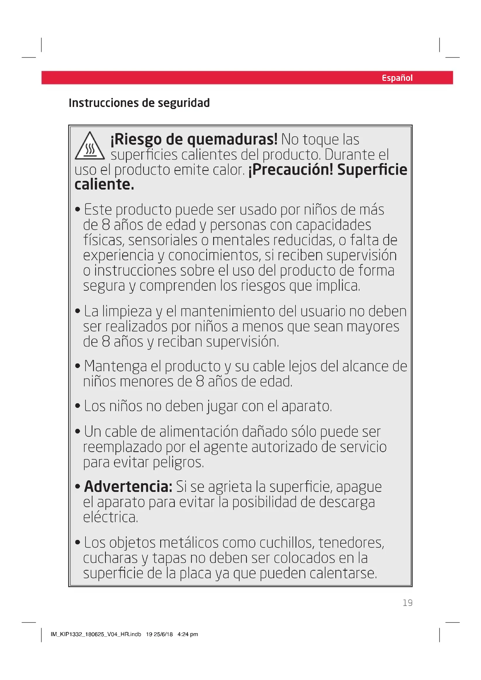 - Los objetos metálicos como cuchillos, tenedores, cucharas y tapas no deben ser colocados en la superficie de la placa ya que pueden calentarse. IM_KIP1332_180625_V04_HR.indb 19 25/6/18 4:24 pmEspañol