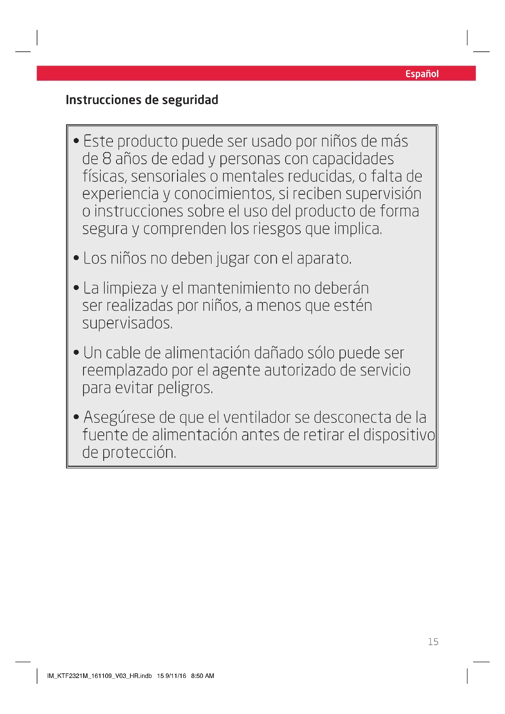 - Asegúrese de que el ventilador se desconecta de la fuente de alimentación antes de retirar el dispositivo de protección. IM_KTF2321M_161109_V03_HR.indb 15 9/11/16 8:50 AMEspañol