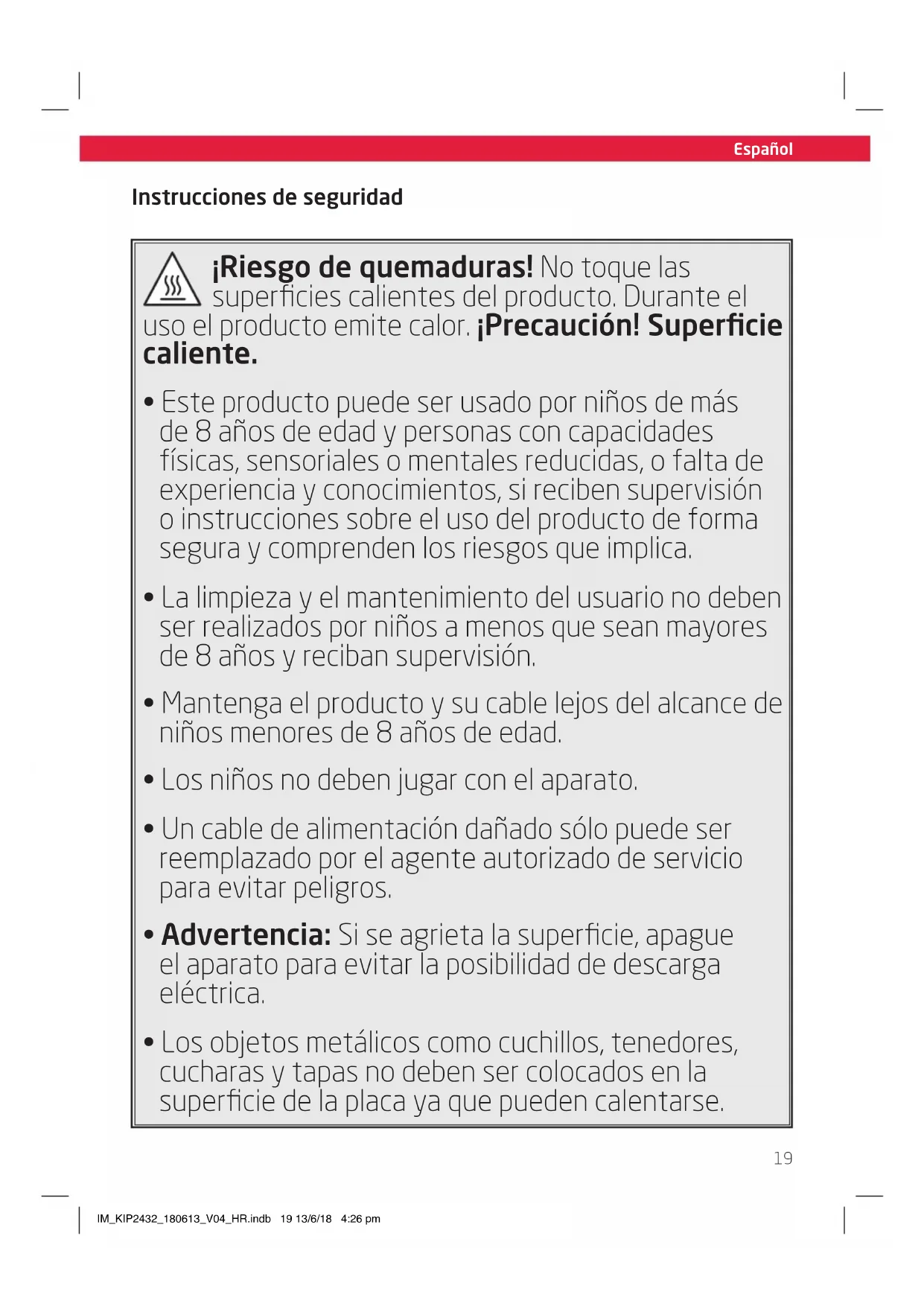 - Los objetos metálicos como cuchillos, tenedores, cucharas y tapas no deben ser colocados en la superficie de la placa ya que pueden calentarse. IM_KIP2432_180613_V04_HR.indb 19 13/6/18 4:26 pmEspañol