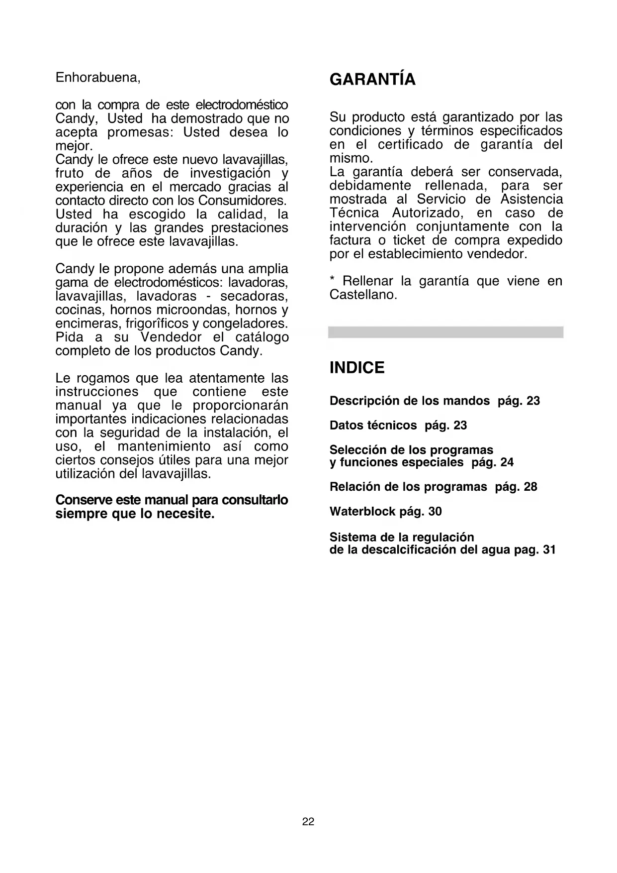 - Rellenar la garantía que viene en Castellano. INDICE Descripción de los mandos pág. 23 Datos técnicos pág. 23 Selección de los programas y funciones especiales pág. 24 Relación de los programas pág. 28 Waterblock pág. 30 Sistema de la regulación de la descalcificación del agua pag. 31G Piloto "INICIO DIFERIDO"