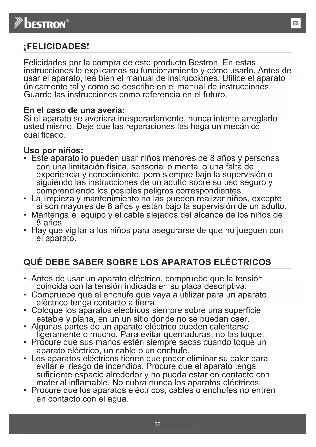 IT¡FELICIDADES! Felicidades por la compra de este producto Bestron. En estas instrucciones le explicamos su funcionamiento y cómo usarlo. Antes de usar el aparato, lea bien el manual de instrucciones. Utilice el aparato únicamente tal y como se describe en el manual de instrucciones. Guarde las instrucciones como referencia en el futuro. En el caso de una avería: Si el aparato se averiara inesperadamente, nunca intente arreglarlo usted mismo. Deje que las reparaciones las haga un mecánico cualificado. Uso por niños: