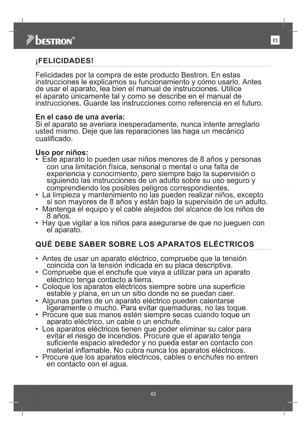 IT¡FELICIDADES! Felicidades por la compra de este producto Bestron. En estas instrucciones le explicamos su funcionamiento y cómo usarlo. Antes de usar el aparato, lea bien el manual de instrucciones. Utilice el aparato únicamente tal y como se describe en el manual de instrucciones. Guarde las instrucciones como referencia en el futuro. En el caso de una avería: Si el aparato se averiara inesperadamente, nunca intente arreglarlo usted mismo. Deje que las reparaciones las haga un mecánico cualificado. Uso por niños: