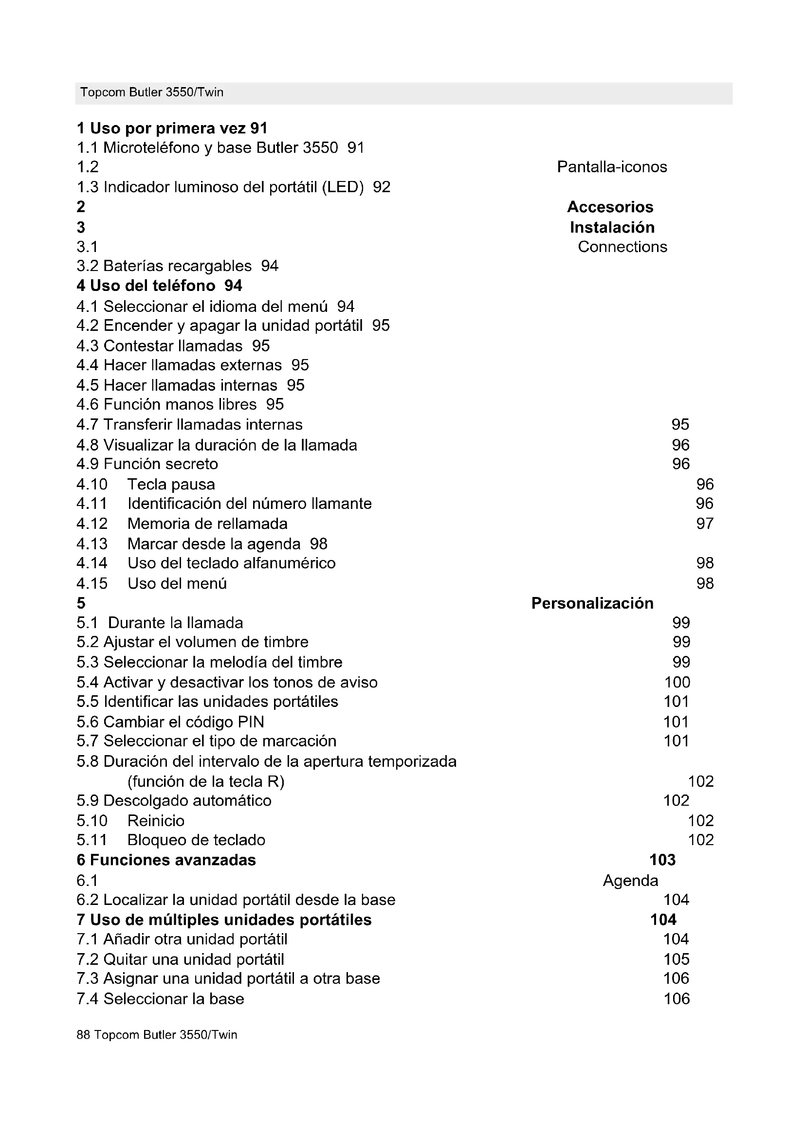 Los daños o defectos causados por tratamiento o utilización incorrectos y los daños resultantes del uso de piezas o accesorios no originales no recomendados por Topcom no están cubiertos por la garantía. Los teléfonos inalámbricos de Topcom están diseñados para funcionar solo con baterías recargables. El daño causado por el uso de baterías no recargables no está cubierto por la garantía. La garantía no cubre los daños causados por factores externos, como rayos, agua y fuego, ni los daños causados durante el transporte. No se podrá reclamar la garantía si se ha cambiado, quitado o si ha quedado ilegible el número de serie de las unidades. Cualquier reclamación de la garantía se invalidará si la unidad ha sido reparado, alterado o modificado por el comprador o por centros de reparación no cualificados o no designados oficialmente por Topcom.114 Topcom Butler 3550/Twin Topcom Butler 3550/Twin 11 Especificaciones técnicas Normativa: DECT (Telecomunicaciones Inalámbricas Digitales Mejoradas) GAP (Generic Access Profile) Gama de frecuencias 1880 Mhz a 1900 MHz Nº de canales 120 canales dúplex Modulación GFSK Codificación de voz 32 Kbits/s Potencia de transmisión 10 mW (potencia media por canal) Alcance 300 m máximo en espacio abierto, 50 m en interiores Alimentación Eléctrica 230V / 50 Hz / 55 mA 8VDC 300mA - 9VDC 120mA Baterías del portátil 2 baterías recargables tipo R3 (AAA), Nimh 550mAh Autonomía del portátil 100 horas en reposo Tiempo en uso 10 horas Tiempo de carga 6-8 horas Condiciones normales de uso +5 ºC a +45 ºC Tipo de marcación Decádica / Tonos Flash time 100 o 250msvisit our website www.topcom.net U8006380