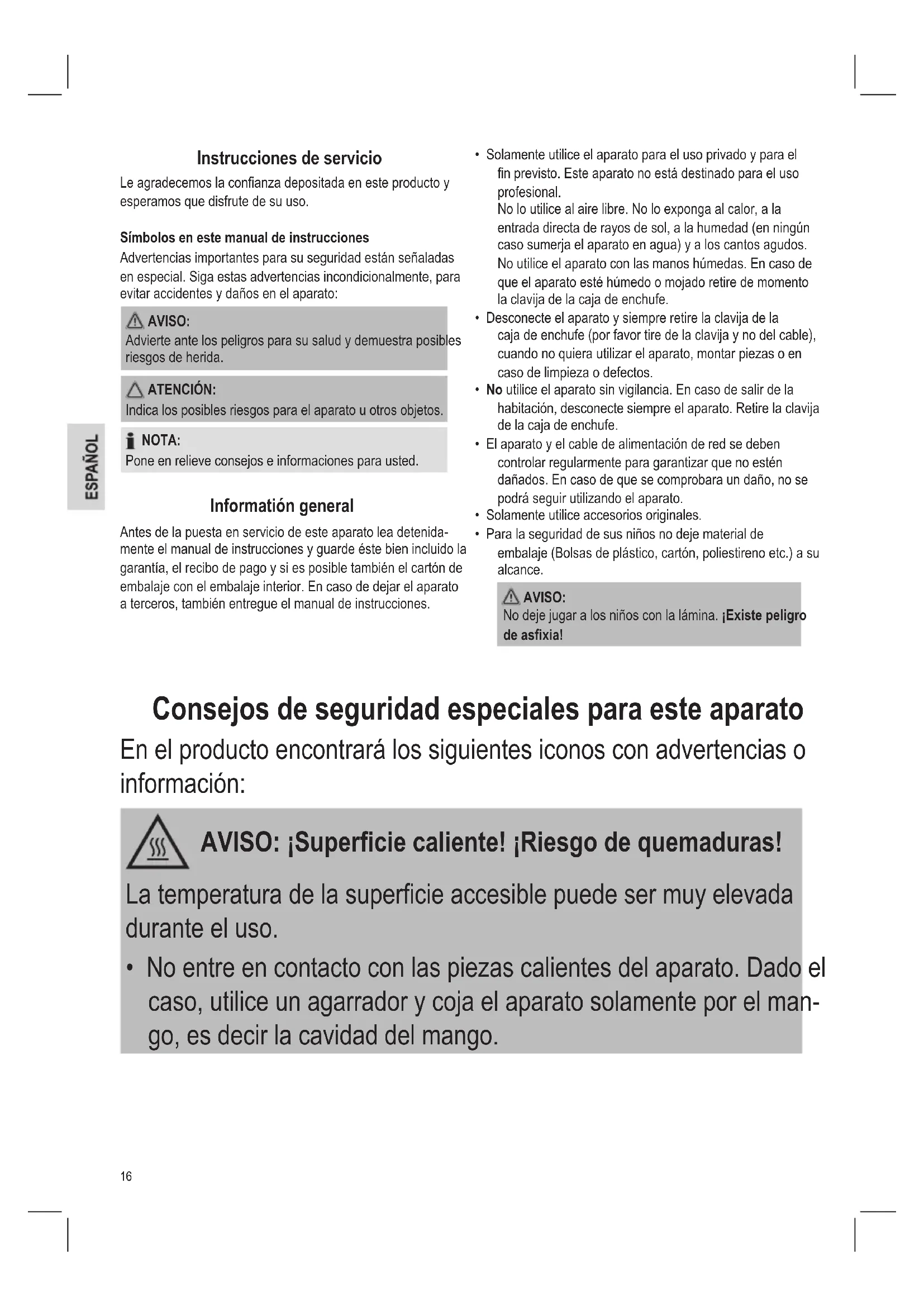 - Para la seguridad de sus niños no deje material de embalaje (Bolsas de plástico, cartón, poliestireno etc.) a su alcance. AVISO: No deje jugar a los niños con la lámina. ¡Existe peligro de asfixia! Consejos de seguridad especiales para este aparato En el producto encontrará los siguientes iconos con advertencias o información: AVISO: ¡Superficie caliente! ¡Riesgo de quemaduras! La temperatura de la supercie accesible puede ser muy elevada durante el uso.