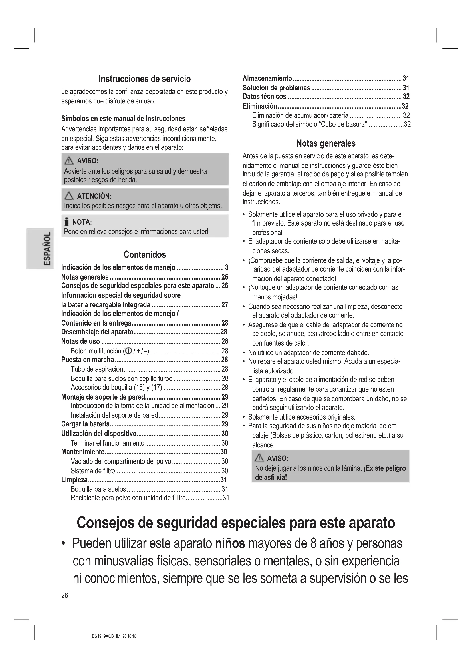 - Consejos de seguridad especiales para este aparato p. 26