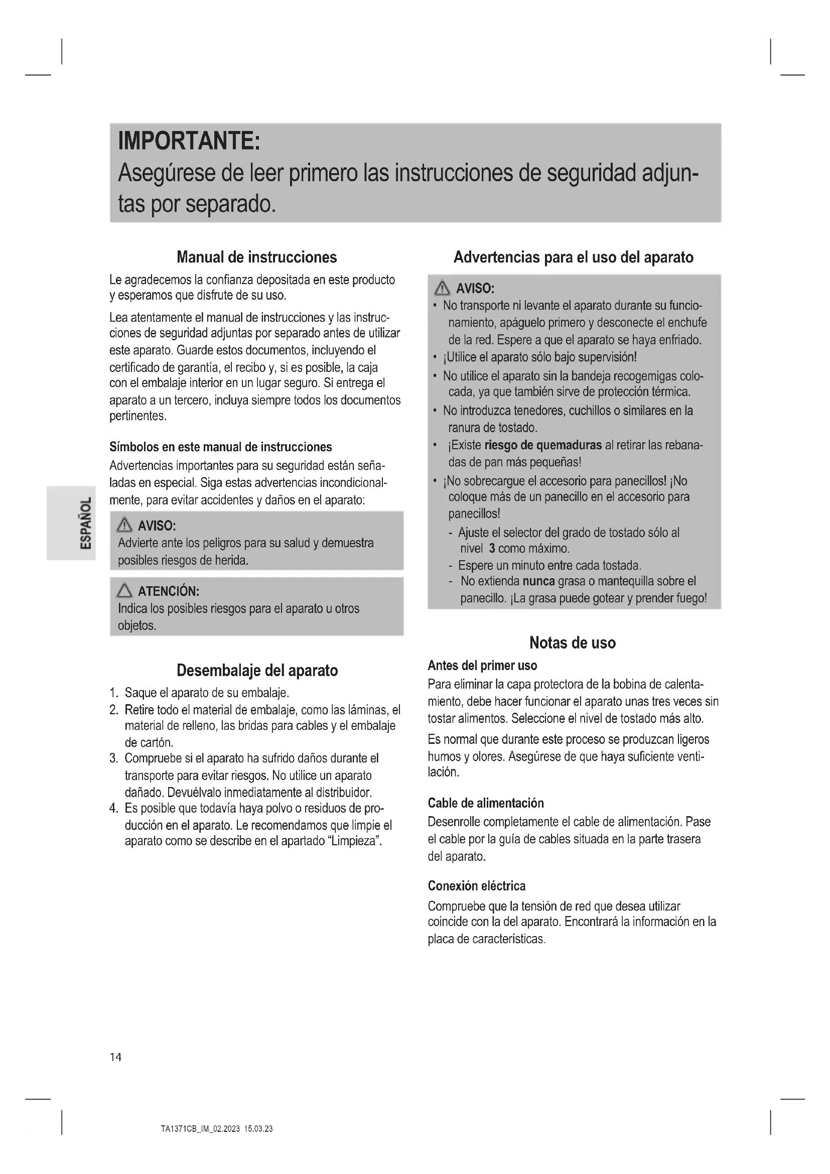 - ¡No sobrecargue el accesorio para panecillos! ¡No coloque más de un panecillo en el accesorio para panecillos! - Ajuste el selector del grado de tostado sólo al nivel 3 como máximo. - Espere un minuto entre cada tostada. - No extienda nunca grasa o mantequilla sobre el panecillo. ¡La grasa puede gotear y prender fuego! Notas de uso Antes del primer uso Para eliminar la capa protectora de la bobina de calenta- miento, debe hacer funcionar el aparato unas tres veces sin tostar alimentos. Seleccione el nivel de tostado más alto. Es normal que durante este proceso se produzcan ligeros humos y olores. Asegúrese de que haya suciente venti- lación. Cable de alimentación Desenrolle completamente el cable de alimentación. Pase el cable por la guía de cables situada en la parte trasera del aparato. Conexión eléctrica Compruebe que la tensión de red que desea utilizar coincide con la del aparato. Encontrará la información en la placa de características.TA1371CB_IM_02.2023 15.03.23