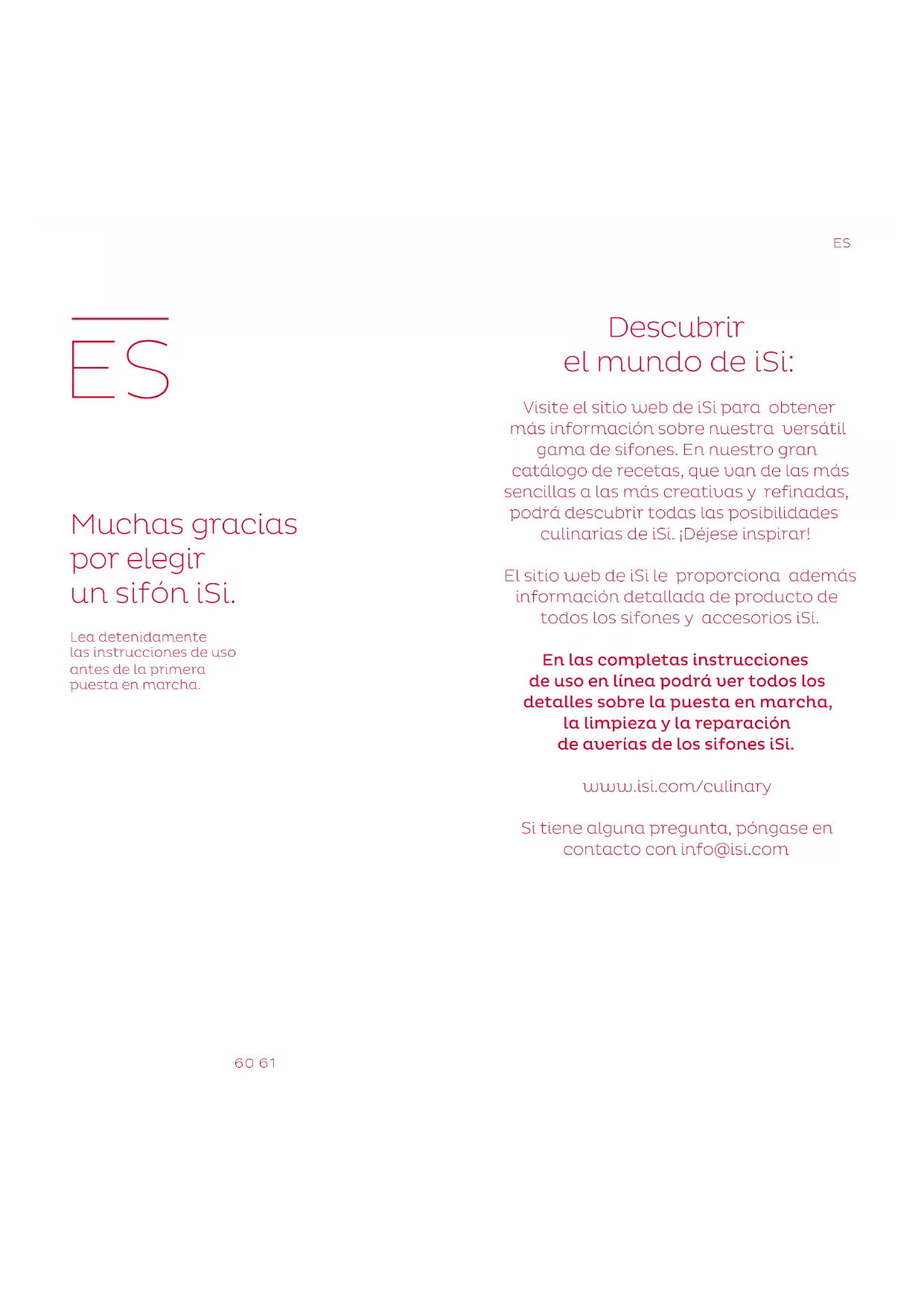 Descubrir el mundo de iSi: Visite el sitio web de iSi para obtener más información sobre nuestra versátil gama de sifones. En nuestro gran catálogo de recetas, que van de las más sencillas a las más creativas y refinadas, podrá descubrir todas las posibilidades culinarias de iSi. ¡Déjese inspirar! El sitio web de iSi le proporciona además información detallada de producto de todos los sifones y accesorios iSi. En las completas instrucciones de uso en línea podrá ver todos los detalles sobre la puesta en marcha, la limpieza y la reparación de averías de los sifones iSi. www.isi.com/culinary Si tiene alguna pregunta, póngase en contacto con info@isi.com62 63 Calidad garantizada: Cada sifón iSi se comprueba exhaustiva mente antes de salir de la fábrica. iSi ofrece una garantía de 2 años sobre el material y la elaboración, salvo que se hayan producido daños por un uso inapropiado. La garantía es válida desde la fecha del recibo de compra. ¡Regístrese ahora en línea y ampliaremos su garantía! Benefíciese de las siguientes ventajas: 3 años de garantía sobre el material y la elaboración, y 5 años de garantía sobre la capacidad aislante de la botella Thermo. La garantía solo es válida si se utilizan las piezas iSi originales especificadas en la lista de componentes del producto. El correcto fun- cionamiento del sifón solo se puede garantizar si únicamente se utilizan cápsulas iSi. En caso de defectos, daños y daños consecuenciales, provocados principalmente por no seguir y/o no leer las instrucciones de uso y sus indicaciones de seguridad, quedarán invalidadas tanto la garantía como cualquier responsabilidad por nuestra parte. Regístrese y aproveche estas ventajas: www.isi.com/garantia