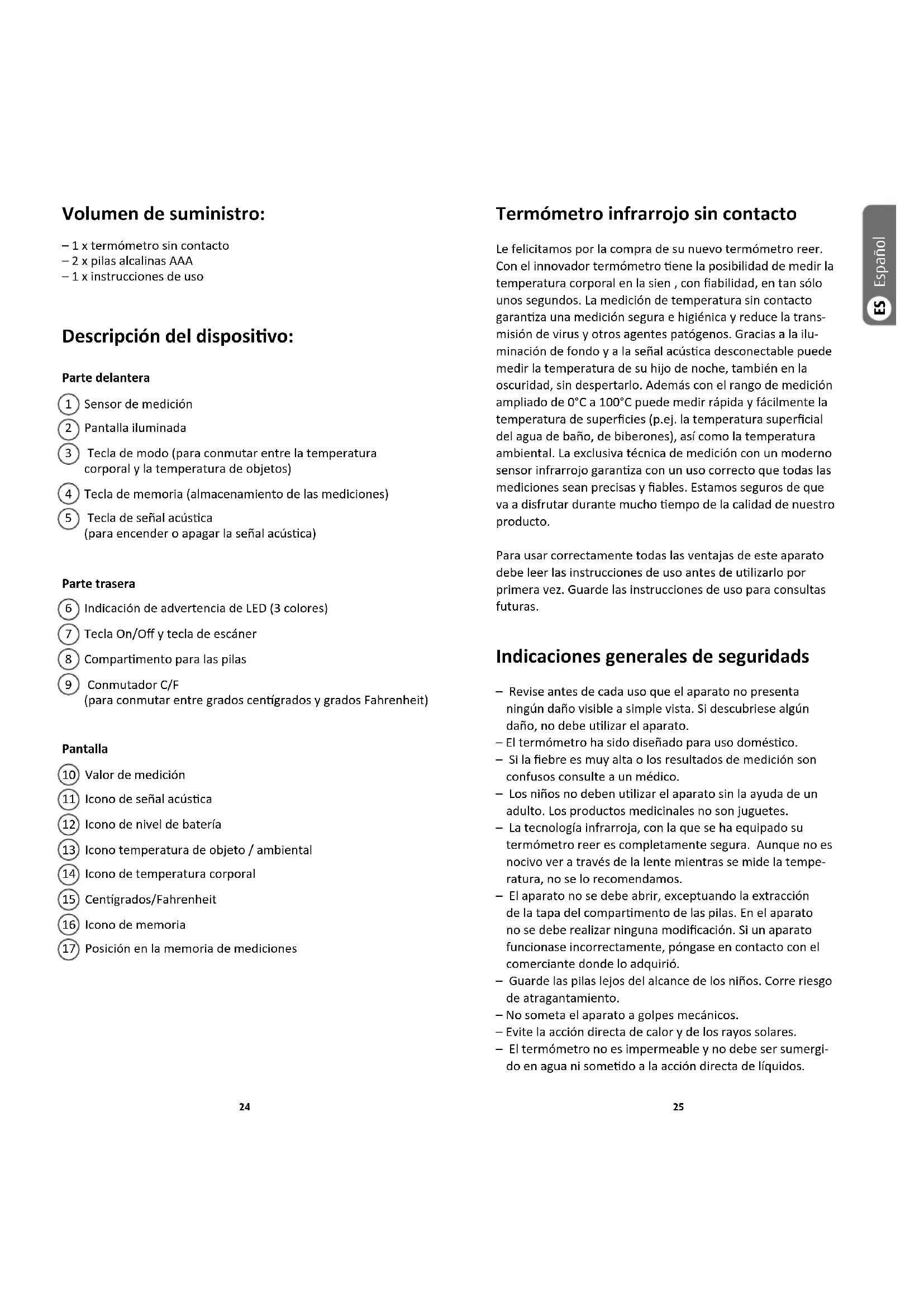 Descripción del dispositivo — 24 Indicaciones generales de seguridad — 25 Información sobre la medición de la temperatura en la sien — 26 Puesta en funcionamiento — 27 Medición de la temperatura corporal — 27 Medición de temperatura de objetos/ambiental — 28 Otras — 29 Limpieza y mantenimiento — 30 Datos técnicos — 30 Solución de problemas — 31 Generalidades — 32 Explicación de los símbolos — 33