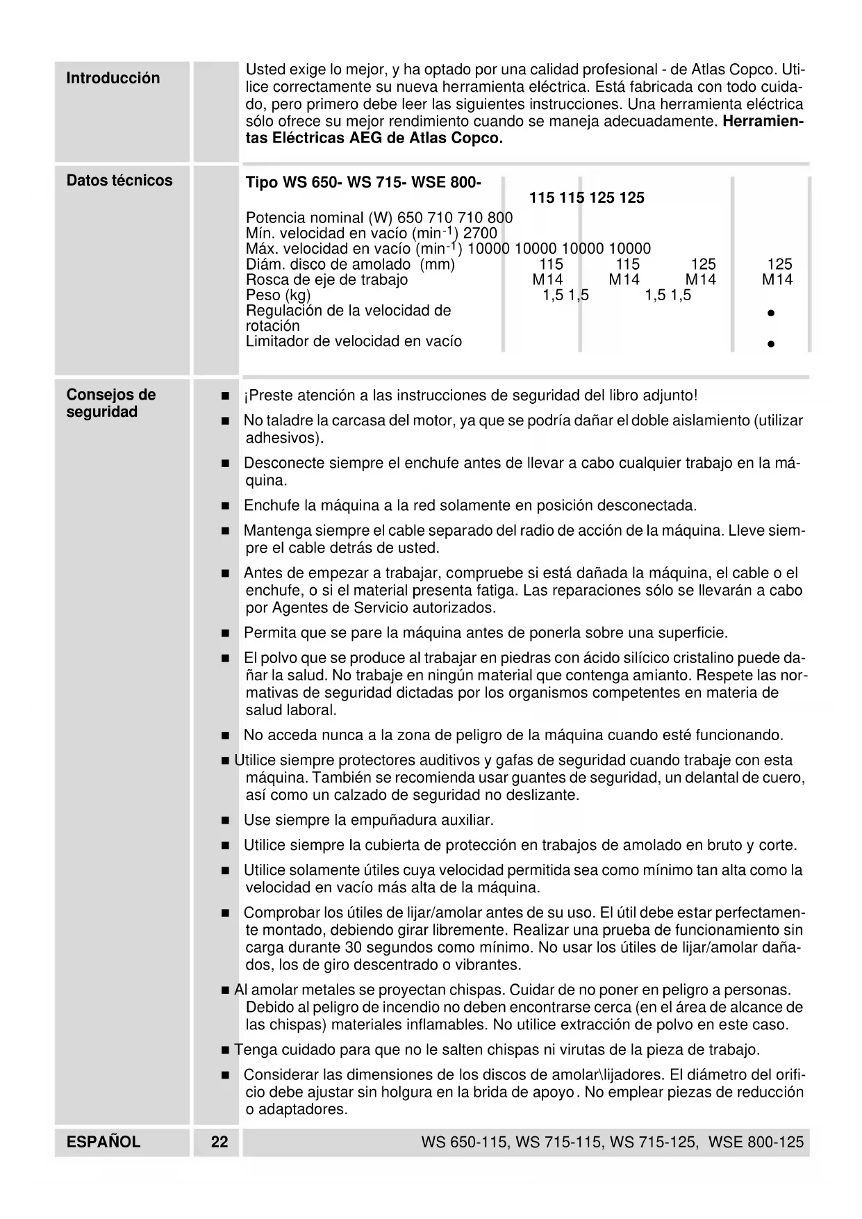 Fare attenzione che la linguetta dell’impugnatura del dado di serraggio veloce - FIX- TEC sia rivolta verso l’alto per serrare e allentare. Dado flangiato Allentare e serrare il dado flangiato con la chiave di serraggio.ITALIANO 21 WS 650-115, WS 715-115, WS 715-125, WSE 800-125 Indicazioni pratiche Per smerigliare non esercitare pressione sul pezzo da lavorare, ma muovere la smerigliatrice con un moto oscillante sul pezzo da lavorare. Modo di sgrossatura La migliore resa viene raggiunta dalla mola per sgrossare, se la smerigliatrice viene accostata a un angolo minimo di 30° sulla superficie piana di molatura. Durante la molatura una forte pressione danneggia la smerigliatrice e aumenta il consumo della mola, quindi il rendimento risulta minore. Mai utilizzare mola abrasiva da taglio diritta per lavori di sgrossatura. Mai esercitare pressione laterale su mole abrasive da taglio. Mola troncatrice Nel lavoro di troncatura la mola sulla superficie piana non va inclinata. Il disco da taglio deve presentare lo spigolo di taglio pulito. La slitta di guida è prescritta per la taglio della pietra. Molatura di piani Utilizzare il platorello per materiali sintetici con parte abrasiva per molatura di piani. Per la levigazione della ruggine o di vecchi strati di vernice bisogna utilizzare una spazzola a fili d’acciaio (spazzola cilindrica). Manutenzione Mantenere sempre pulita l’apparecchiatura e le fessure di ventilazione. Utilizzare esclusivamente accessori e pezzi di ricambio AEG. L’installazione di pez- zi di ricambio non specificamente prescritti dall’AEG va preferibilmente effettuata dal servizio di assistenza clienti AEG (ved. opuscolo Garanzia/Indirizzi Assistenza tecnica). In caso di mancanza del disegno esploso, può essere richiesto al seguente indiriz- zo: Atlas Copco Tools Italia Via Fratelli Gracchi 39, 20092 Cinisello Balsamo Mi. Accessorio Per la scelta degli accessori vedere a pag. 2-3. Per la vasta gamma di accessori e relativi codici consultare i nostri cataloghi.ESPAÑOL 22 WS 650-115, WS 715-115, WS 715-125, WSE 800-125 Introducción Usted exige lo mejor, y ha optado por una calidad profesional - de Atlas Copco. Uti- lice correctamente su nueva herramienta eléctrica. Está fabricada con todo cuida- do, pero primero debe leer las siguientes instrucciones. Una herramienta eléctrica sólo ofrece su mejor rendimiento cuando se maneja adecuadamente. Herramien- tas Eléctricas AEG de Atlas Copco. Datos técnicos Consejos de seguridad ■ ¡Preste atención a las instrucciones de seguridad del libro adjunto! ■ No taladre la carcasa del motor, ya que se podría dañar el doble aislamiento (utilizar adhesivos). ■ Desconecte siempre el enchufe antes de llevar a cabo cualquier trabajo en la má- quina. ■ Enchufe la máquina a la red solamente en posición desconectada. ■ Mantenga siempre el cable separado del radio de acción de la máquina. Lleve siem- pre el cable detrás de usted. ■ Antes de empezar a trabajar, compruebe si está dañada la máquina, el cable o el enchufe, o si el material presenta fatiga. Las reparaciones sólo se llevarán a cabo por Agentes de Servicio autorizados. ■ Permita que se pare la máquina antes de ponerla sobre una superficie. ■ El polvo que se produce al trabajar en piedras con ácido silícico cristalino puede da- ñar la salud. No trabaje en ningún material que contenga amianto. Respete las nor- mativas de seguridad dictadas por los organismos competentes en materia de salud laboral. ■ No acceda nunca a la zona de peligro de la máquina cuando esté funcionando. ■ Utilice siempre protectores auditivos y gafas de seguridad cuando trabaje con esta máquina. También se recomienda usar guantes de seguridad, un delantal de cuero, así como un calzado de seguridad no deslizante. ■ Use siempre la empuñadura auxiliar. ■ Utilice siempre la cubierta de protección en trabajos de amolado en bruto y corte. ■ Utilice solamente útiles cuya velocidad permitida sea como mínimo tan alta como la velocidad en vacío más alta de la máquina. ■ Comprobar los útiles de lijar/amolar antes de su uso. El útil debe estar perfectamen- te montado, debiendo girar libremente. Realizar una prueba de funcionamiento sin carga durante 30 segundos como mínimo. No usar los útiles de lijar/amolar daña- dos, los de giro descentrado o vibrantes. ■ Al amolar metales se proyectan chispas. Cuidar de no poner en peligro a personas. Debido al peligro de incendio no deben encontrarse cerca (en el área de alcance de las chispas) materiales inflamables. No utilice extracción de polvo en este caso. ■ Tenga cuidado para que no le salten chispas ni virutas de la pieza de trabajo. ■ Considerar las dimensiones de los discos de amolar\lijadores. El diámetro del orifi- cio debe ajustar sin holgura en la brida de apoyo. No emplear piezas de reducción o adaptadores. Tipo WS 650- WS 715- WSE 800-