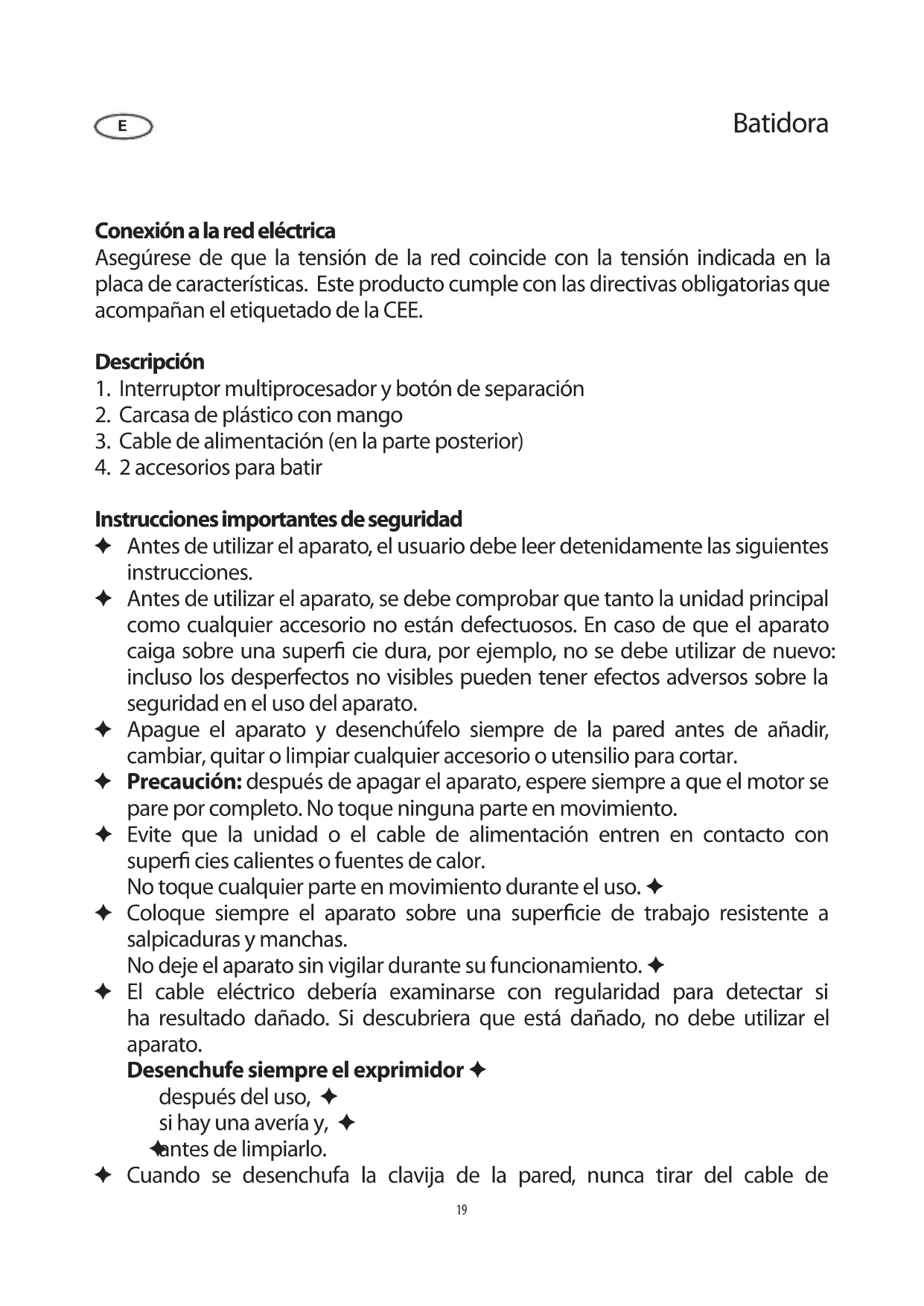 19alimentación; sino asir siempre la clavija misma. No deje luego el cable colgando. Este aparato no debe ser utilizado por ninguna persona (incluidos niños) con ✦ reducidas facultades físicas, sensoriales o mentales y tampoco por personas sin experiencia ni conocimiento, a menos que hayan recibido supervisión o instrucciones sobre el uso del aparato por parte de una persona responsable y por su propia seguridad. Los niños deben estar bajo supervisión para garantizar que no juegan con ✦ el aparato. Precaución: ✦ mantenga a los niños alejados del material de embalaje, porque podría ser peligroso, existe el peligro de as xia. No se acepta responsabilidad alguna si hay averías a consecuencia del ✦ uso incorrecto del aparato o si estas instrucciones no han sido observadas debidamente. Este aparato está diseñado sólo para uso doméstico y no comercial. ✦ Utilice solo accesorios originales; el uso de accesorios distintos a los ✦ suministrados por el fabricante puede ser peligroso para el usuario. Para cumplir con las normas de seguridad y para evitar riesgos, las reparaciones ✦ de los aparatos eléctricos deben ser efectuadas por técnicos cuali cados, incluso al reemplazar el cable de alimentación. Si es preciso repararlo, se debe mandar el aparato a uno de nuestros servicios de asistencia postventa. Las direcciones se encuentran en el apéndice de este manual. Funcionamiento Funcionamiento de corta duración Cuando se emplean las velocidades 1 - 5, no se debe hacer funcionar la unidad durante más de 3 minutos ininterrumpidamente. Después apague la batidora y deje que se enfríe el motor durante aproximadamente 15 minutos. Posiciones del interruptor La batidora está dotada de un interruptor multiprocesador. Dispone de los siguientes niveles: 0 La unidad está apagada 1 velocidad muy baja 2 velocidad baja 3 velocidad media 4 velocidad media alta 5 velocidad alta 20Al batir mezclas ligeras y líquidas o al incorporar ingredientes adicionales, se ✦ recomienda usar la velocidad 1 y la 2. Para mezclar, conviene emplear la velocidad ✦ 3 -5. Información general Antes de la primera utilización, limpie los accesorios. ✦ Tomando en cuenta la cantidad de ingredientes, escoja un recipiente ✦ adecuadamente profundo. Puede servir cualquier recipiente, contenedor redondo o vaso, con tal que ✦ sea a prueba de rasguños y que los accesorios puedan girar libremente en su interior. Después de acoplar los accesorios, coja la batidora y coloque los accesorios ✦ dentro del contenedor que lleva los ingredientes. Utilice el pulgar para poner la unidad en marcha. ✦ Al terminar la mezcla o si desea interrumpir la operación, apague el aparato ✦ antes de sacar los accesorios de la mezcla. Los accesorios para batir Para las mezclas ligeras y líquidas como las cremas, el puré de patatas, las claras del huevo o la nata, inserte uno o los dos accesorios de batir en las aberturas en la super cie inferior de la batidora y empújelos suavemente hacia arriba hasta que queden sujetos. Separación de los accesorios Apague el aparato y desenchúfelo de la pared. Los accesorios se desprenden automáticamente cuando se aprieta el botón de separación . Mantenimiento y Limpieza General Antes de limpiar el aparato, asegurarse de que esté desconectado de la red ✦ eléctrica. Para evitar riesgo de electrocución, no limpie la unidad con agua ni la ✦ sumerja. La carcasa se puede limpiar con un paño húmedo que no suelte pelusa. ✦ Los accesorios para batir se pueden limpiar utilizando agua caliente y un ✦ detergente suave. Eliminación Los electrodomésticos viejos o defectuosos no se deben tirar en la basura de su hogar, sino que deben desecharse en los puntos públicos de reciclaje y recogida. 21Garantía Este producto está garantizado por un período de dos años, contado a partir de la fecha de compra, contra cualquier defecto en materiales o mano de obra. Esta garantía sólo es válida si el aparato ha sido utilizado siguiendo las instrucciones de uso, sempre que no haya sido modi cado, reparado o manipulado por cualquier persona no autorizada o haya sido estropeado como consecuencia de un uso inadecuado del mismo. Naturalmente esta garantía no cubre las averías debidas a uso o desgaste normales, así como aquellas piezas de fácil rotura tales como cristales, piezas cerámicas, etc. Esta garantía no afecta a los derechos legales del consumidor ante la falta de conformidad del producto con el contrato de compraventa. 22Sbattitore Collegamento alla rete Assicuratevi che la tensione d’alimentazione corrisponda alla tensione indicata sulla targhetta portadati. Questo prodotto è conforme alle direttive vincolanti per l’etichettatura CE. Descrizione dell’apparecchio