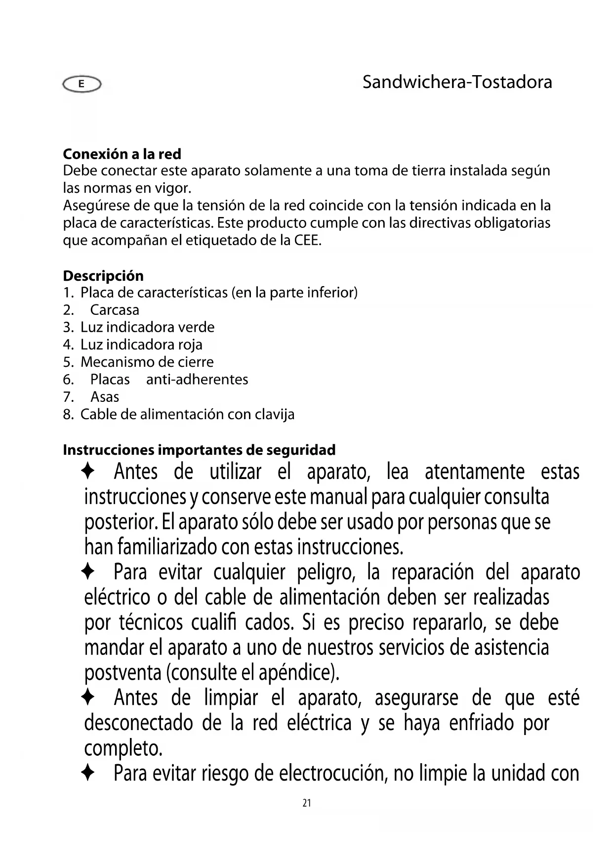 Aviso: Este símbolo indica que las super cies accesibles de la carcasa pueden llegar a estar muy calientes durante el funcionamiento del aparato. No toque ninguna pieza del aparato excepto la empuñadura; utilice un paño adecuado para el horno cuando sea necesario. ✦ Este aparato podrá ser utilizado por niños (mayores de 8 años) y personas con reducidas facultades físicas, sensoriales o mentales, o sin experiencia ni conocimiento del producto, siempre que hayan recibido la supervisión o instrucciones referentes al uso del aparato y entiendan por completo el peligro y las precauciones de seguridad. ✦ Los niños no deben jugar con el aparato. ✦ No se debe permitir que los niños realicen ningún trabajo de limpieza o mantenimiento del aparato a menos que estén bajo vigilancia y tengan más de 8 años. ✦ El aparato y su cable eléctrico siempre se deben mantener fuera del alcance de niños menores de 8 años. ✦ Precaución: mantenga a los niños alejados del material de embalaje, porque podría ser peligroso, existe el peligro de as xia. ✦ Antes de utilizar el aparato, siempre se debe comprobar que tanto la unidad principal, el cable de alimentación como cualquier accesorio no están defectuosos. En caso de que el aparato haya caído sobre una super cie dura, o se haya tirado en exceso del cable de alimentación, no se deberá utilizar de nuevo: incluso los desperfectos no visibles pueden tener efectos adversos sobre la seguridad en el uso del aparato. ✦ Procure que la carcasa y el cable no estén en contacto con super cies23 calientes como placas o estufas eléctricas, y tampoco próximos a una salida de gas. ✦ Desenchufe siempre el aparato - después del uso, - si hay una avería, y - antes de limpiarlo. ✦ Cuando se desenchufa la clavija de la pared, nunca tirar del cable de alimentación; sino asir siempre la clavija misma. ✦ No deje el cable colgando. ✦ Antes de trasladar o guardar el aparato, asegúrese de que se ha enfriado por completo. ✦ Ponga la unidad siempre sobre una encimera resistente al calor, insensible a las salpicaduras y manchas, y con su ciente espacio alrededor. ✦ No ponga el aparato en funcionamiento sin supervisión, y no lo coloque debajo de cortinas, armarios empotrados ni cerca de materiales in amables. ✦ No se acepta responsabilidad alguna si hay averías a consecuencia del uso incorrecto del aparato o si estas instrucciones no han sido observadas debidamente. ✦ Este aparato ha sido diseñado para el uso doméstico u otra aplicación similar, por ejemplo - en o cinas y otros puntos comerciales, - en empresas agrícolas, - por los clientes de hoteles, pensiones, etc. y establecimientos similares, - en casas rurales. Antes del primer uso ✦ Extraiga el aparato de todo el embalaje. ✦ Espere a que el aparato se caliente durante unos 10 minutos con las placas tostadoras cerradas. Esto servirá para eliminar el característico olor a nuevo durante el primer uso de la sandwichera-tostadora. Mantenga la habitación bien ventilada durante este tiempo. ✦ Deje el aparato enfriarse y límpielo a continuación. Ver la parte Limpieza y mantenimiento. Funcionamiento ✦ Enchufe el cable eléctrico en la toma de pared: La luz indicadora principal se iluminará. ✦ Después de un breve periodo de calentamiento de aproximadamente 8 minutos, el aparato puede utilizarse. Cuando se alcance la temperatura deseada, se encenderá la luz verde de listo para usar.24 ✦ Abra las placas de la sandwichera. ✦ Coloque los dos sándwiches preparados en la placa inferior y cierre con precaución la placa superior. ✦ Cierre la carcasa empujando una pieza sobre la otra mediante las asas, y ajústelas correctamente con el cierre. Precaución: No intente cerrar las placas forzándolas; si resulta difícil cerrarlas, reduzca la cantidad de alimentos. ✦ El tiempo de preparación del sándwich es generalmente de 3 a 4 minutos, según el tipo de pan y el relleno. ✦ Abra el cierre, abra el aparato y extraiga el sándwich. Para evitar dañar las placas antiadherentes, no utilice ningún objeto a lado ni puntiagudo para extraer los sándwiches. ✦ Si desea preparar más sándwiches, cierre la placa superior y espere hasta que la luz verde de listo para usar se encienda de nuevo. ✦ Después del uso, extraiga el cable eléctrico de la toma de la pared. La luz indicadora principal se apagará. Después, limpie el aparato. Limpieza y mantenimiento ✦ Antes de limpiar, extraiga la clavija del enchufe y espere a que el aparato se enfríe con las dos placas abiertas. ✦ Para evitar riesgo de electrocución, no limpie la unidad con agua ni la sumerja ✦ No use ni abrasivos ni agentes de limpieza. ✦ Gracias a las placas antiadherentes, el aparato no requiere ningún tipo de mantenimiento. Las placas se pueden limpiar con un paño o un cepillo suave ligeramente humedecido. ✦ El exterior del aparato se puede limpiar con un trapo sin pelusa, humedecido. Eliminación Los dispositivos en los que gura este símbolo deben ser eliminados por separado de la basura doméstica, porque contienen componentes valiosos que pueden ser reciclados. La eliminación correcta ayuda a proteger el medio ambiente y la salud de las personas. Consulte a las autoridades municipales o el establecimiento de venta donde podrán facilitarle la información relevante. Los aparatos eléctricos que ya no son utilizables se pueden entregar gratuitamente en el establecimiento de venta. Garantía Este producto está garantizado por un período de dos años, contado a partir25 de la fecha de compra, contra cualquier defecto en materiales o mano de obra. Esta garantía sólo es válida si el aparato ha sido utilizado siguiendo las instrucciones de uso, sempre que no haya sido modi cado, reparado o manipulado por cualquier persona no autorizada o haya sido estropeado como consecuencia de un uso inadecuado del mismo. Naturalmente esta garantía no cubre las averías debidas a uso o desgaste no