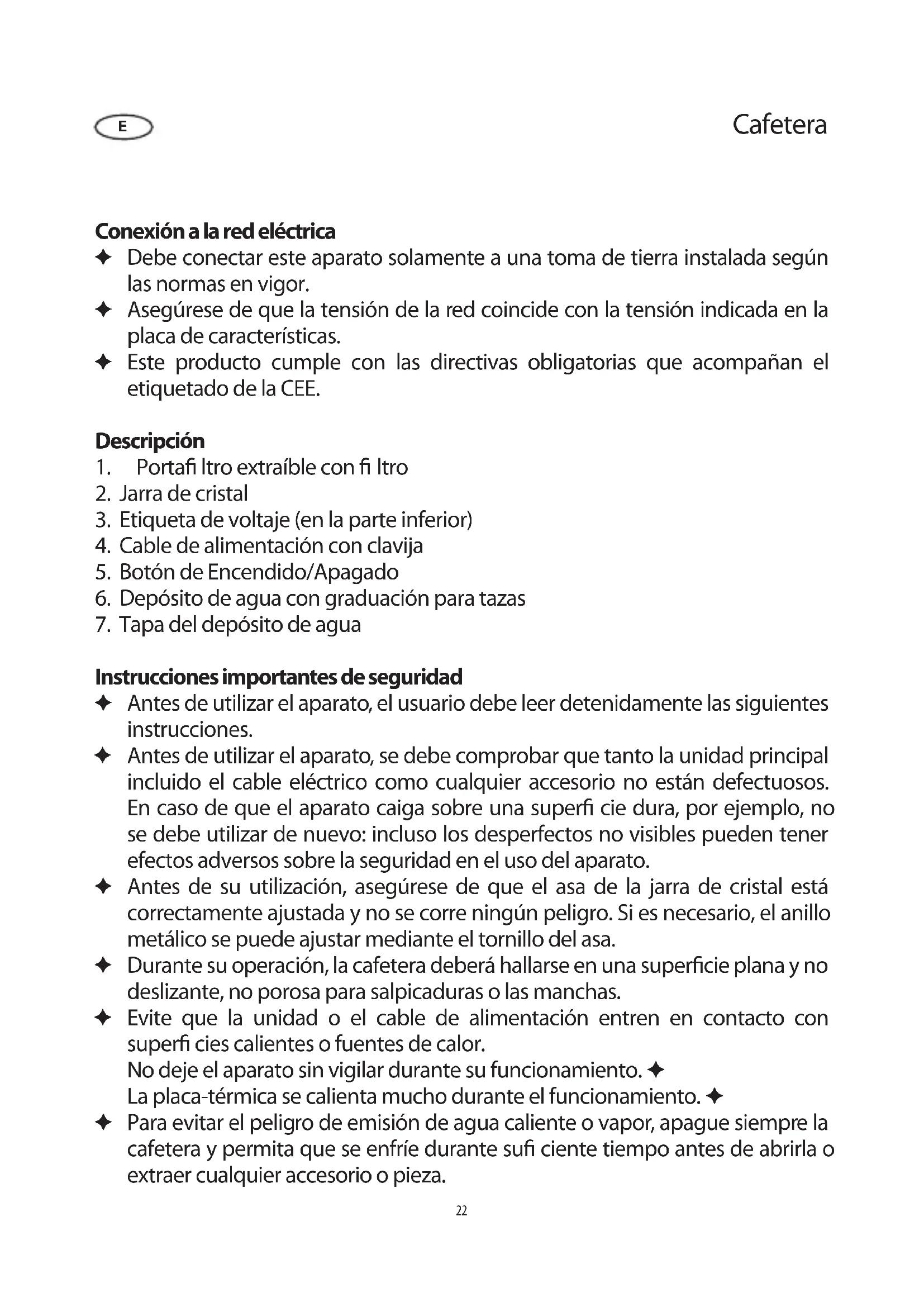 Instrucciones importantes de seguridad Antes de utilizar el aparato, el usuario debe leer detenidamente las siguientes ✦ instrucciones. Antes de utilizar el aparato, se debe comprobar que tanto la unidad principal ✦ incluido el cable eléctrico como cualquier accesorio no están defectuosos. En caso de que el aparato caiga sobre una super cie dura, por ejemplo, no se debe utilizar de nuevo: incluso los desperfectos no visibles pueden tener efectos adversos sobre la seguridad en el uso del aparato. Antes de su utilización, asegúrese de que el asa de la jarra de cristal está ✦ correctamente ajustada y no se corre ningún peligro. Si es necesario, el anillo metálico se puede ajustar mediante el tornillo del asa. Durante su operación, la cafetera deberá hallarse en una super cie plana y no ✦ deslizante, no porosa para salpicaduras o las manchas. Evite que la unidad o el cable de alimentación entren en contacto con ✦ super cies calientes o fuentes de calor. No deje el aparato sin vigilar durante su funcionamiento. ✦ La placa-térmica se calienta mucho durante el funcionamiento. ✦ Para evitar el peligro de emisión de agua caliente o vapor, apague siempre la ✦ cafetera y permita que se enfríe durante su ciente tiempo antes de abrirla o extraer cualquier accesorio o pieza.