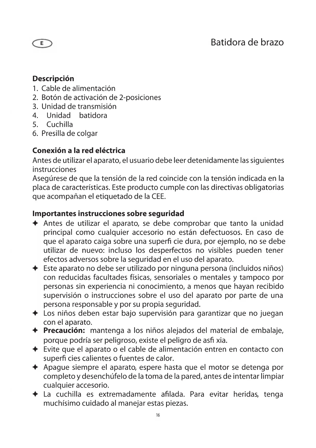 Conexión a la red eléctrica Antes de utilizar el aparato, el usuario debe leer detenidamente las siguientes instrucciones Asegúrese de que la tensión de la red coincide con la tensión indicada en la placa de características. Este producto cumple con las directivas obligatorias que acompañan el etiquetado de la CEE. Importantes instrucciones sobre seguridad Antes de utilizar el aparato, se debe comprobar que tanto la unidad ✦ principal como cualquier accesorio no están defectuosos. En caso de que el aparato caiga sobre una super cie dura, por ejemplo, no se debe utilizar de nuevo: incluso los desperfectos no visibles pueden tener efectos adversos sobre la seguridad en el uso del aparato. Este aparato no debe ser utilizado por ninguna persona (incluidos niños) ✦ con reducidas facultades físicas, sensoriales o mentales y tampoco por personas sin experiencia ni conocimiento, a menos que hayan recibido supervisión o instrucciones sobre el uso del aparato por parte de una persona responsable y por su propia seguridad. Los niños deben estar bajo supervisión para garantizar que no juegan ✦ con el aparato. Precaución: ✦ mantenga a los niños alejados del material de embalaje, porque podría ser peligroso, existe el peligro de as xia. Evite que el aparato o el cable de alimentación entren en contacto con ✦ super cies calientes o fuentes de calor. Apague siempre el aparato, espere hasta que el motor se detenga por ✦ completo y desenchúfelo de la toma de la pared, antes de intentar limpiar cualquier accesorio. La cuchilla es extremadamente a lada. Para evitar heridas, tenga ✦ muchísimo cuidado al manejar estas piezas.