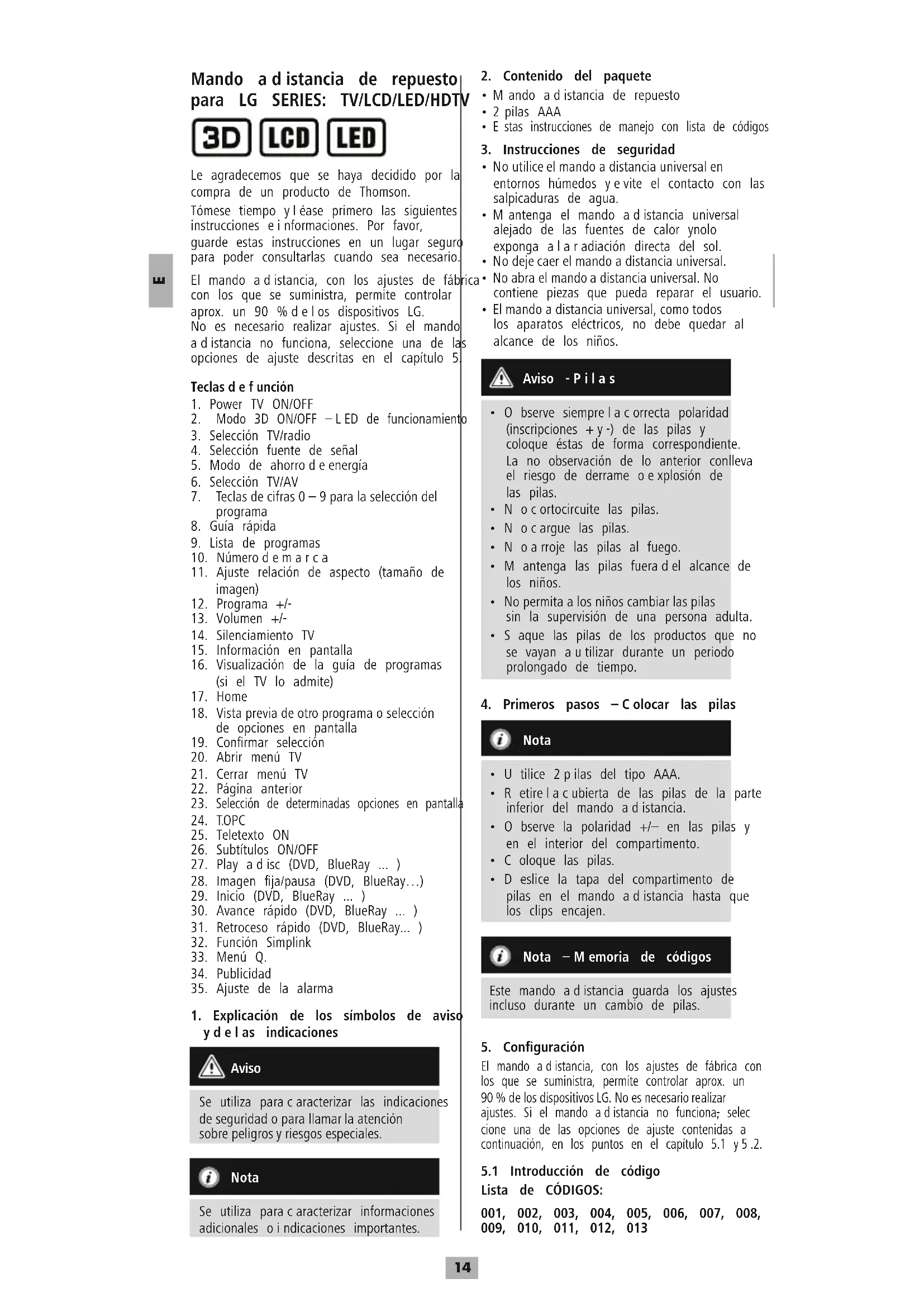 Mando adistancia de repuesto para LG SERIES: TV/LCD/LED/HDTV Le agradecemos que se haya decidido por la compra de un producto de Thomson. Tómese tiempo yléase primero las siguientes instrucciones einformaciones. Por favor, guarde estas instrucciones en un lugar seguro para poder consultarlas cuando sea necesario. El mando adistancia, con los ajustes de fábrica con los que se suministra, permite controlar aprox. un 90 %delos dispositivos LG. No es necesario realizar ajustes. Si el mando adistancia no funciona, seleccione una de las opciones de ajuste descritas en el capítulo 5. Teclasdefunción