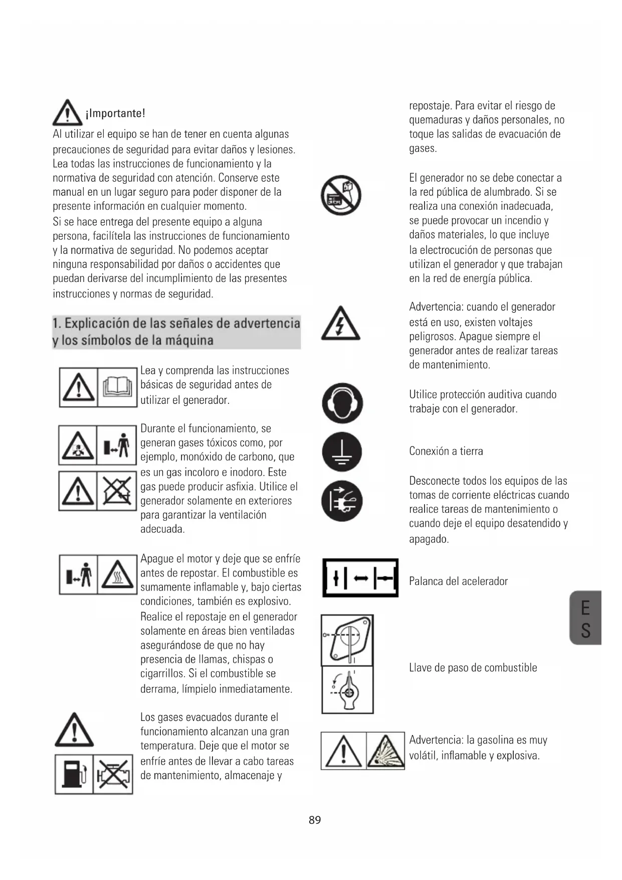 Z89 repostaje. Para evitar el riesgo de quemaduras y daños personales, no toque las salidas de evacuación de gases. El generador no se debe conectar a la red pública de alumbrado. Si se realiza una conexión inadecuada, se puede provocar un incendio y daños materiales, lo que incluye la electrocución de personas que utilizan el generador y que trabajan en la red de energía pública. Advertencia: cuando el generador está en uso, existen voltajes peligrosos. Apague siempre el generador antes de realizar tareas de mantenimiento. Utilice protección auditiva cuando trabaje con el generador. Conexión a tierra Desconecte todos los equipos de las tomas de corriente eléctricas cuando realice tareas de mantenimiento o cuando deje el equipo desatendido y apagado. Palanca del acelerador Llave de paso de combustible Advertencia: la gasolina es muy volátil, inflamable y explosiva. ¡Importante! Al utilizar el equipo se han de tener en cuenta algunas precauciones de seguridad para evitar daños y lesiones. Lea todas las instrucciones de funcionamiento y la normativa de seguridad con atención. Conserve este manual en un lugar seguro para poder disponer de la presente información en cualquier momento. Si se hace entrega del presente equipo a alguna persona, facilítela las instrucciones de funcionamiento y la normativa de seguridad. No podemos aceptar ninguna responsabilidad por daños o accidentes que puedan derivarse del incumplimiento de las presentes instrucciones y normas de seguridad.