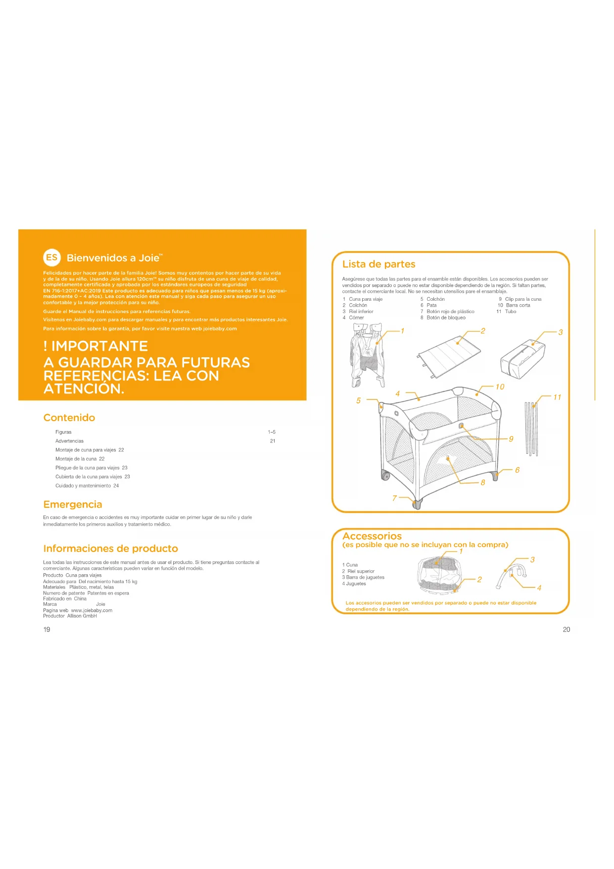 ATENCIÓN. Contenido Figuras 1–5Advertencias 21Montaje de cuna para viajes 22Montaje de la cuna 22Pliegue de la cuna para viajes 23Cubierta de la cuna para viajes 23Cuidado y mantenimiento 24 Emergencia En caso de emergencia o accidentes es muy importante cuidar en primer lugar de su niño y darle inmediatamente los primeros auxilios y tratamiento médico. Informaciones de producto Lea todas las instrucciones de este manual antes de usar el producto. Si tiene preguntas contacte al comerciante. Algunas características pueden variar en función del modelo.Producto Cuna para viajesAdecuado para Del nacimiento hasta 15 kgMateriales Plástico, metal, telasNumero de patente Patentes en esperaFabricado en ChinaMarca JoiePagina web www.joiebaby.com Productor Allison GmbH 1 Cuna para viaje 2 Colchón 3 Riel inferior 4 Córner 5 Colchón 6 Pata 7 Botón rojo de plástico 8 Botón de bloqueo 9 Clip para la cuna 10 Barra corta11 Tubo Lista de partes Asegúrese que todas las partes para el ensamble están disponibles. Los accesorios pueden ser vendidos por separado o puede no estar disponible dependiendo de la región. Si faltan partes, contacte el comerciante local. No se necesitan utensilios pare el ensamblaje. Accessorios (es posible que no se incluyan con la compra) 1 Cuna2 Riel superior3 Barra de juguetes4 JuguetesLos accesorios pueden ser vendidos por separado o puede no estar disponible dependiendo de la región.