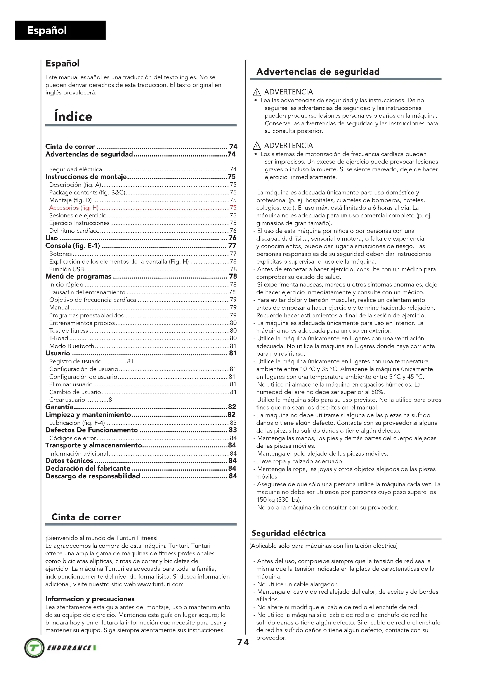 - Prima di piegare l’apparecchio, verificare che l’inclinazione sia 0%. Se l’inclinazione non è 0%, ripiegando l’apparecchio si può danneggiare il meccanismo. - Spostare l’apparecchio come illustrato (fig. E3). Spostare l’apparecchio e abbassarlo con cura. Collocare l’apparecchio su una base protettiva per evitare danni alla superficie del pavimento. Spostare l’apparecchiatura con attenzione sulle superfici irregolari. Non spostare l’apparecchio al piano superiore utilizzando le ruote ma sostenerlo per le impugnature. - Riporre l’apparecchio in posizione verticale (fig. E2). Riporre l’apparecchio in un luogo asciutto con la minore variazione di temperatura possibile. Informazioni aggiuntive Smaltimento dell’imballo Le linee guide governative chiedono di ridurre la quantità di rifiuti smaltiti nelle discariche. Per questo vi chiediamo di smaltire in modo responsabile tutti i rifiuti d’imballo presso dei centri di riciclaggio pubblici. Smaltimento a fine vita Noi di Tunturi speriamo che possiate godervi molti anni di piacevole uso dal nostro fitness trainer. Tuttavia, arriverà il momento quando il vostro fitness trainer arriverà alla fine della sua vita utile. Secondo la Legislazione Europea WEEE voi siete responsabili per uno smaltimento appropriato del vostro fitness trainer presso una struttura di raccolta pubblica autorizzata. Dati tecnici Parametrro Unità di misura Valore Tensione di alimentazioneVca 210 ~ 240Frequenza di alimentazioneHZ 50 ~ 60Motore CV 2.5 5.5 Max.Velocità Km/H 0.5 ~ 16.0Velocità Mph 0.3 ~ 10.0Inclinazione Step 0 ~ 15Lunghezza (ripiegato)Cm 193.0 (137.0)Lunghezza (ripiegato)Inch 76.0 (53.9)Larghezza Cm 82.5Larghezza Inch 32.5Altezza (ripiegato)Cm 149.0 (155.0)Altezza (ripiegato)Inch 58.7 (61.0)Peso Kg 117.0Peso Lbs 257.9Peso massimo utente Kb 150Peso massimo utente Lbs 330Ricevitore per la frequenza cardiaca telemetricoKhz 5.3 Khz Dichiarazione del fabbricante Tunturi New Fitness BV dichiara che questo prodotto è conforme ai seguenti standard e direttive: EN 957 (HA), 89/336/CEE. Pertanto sul prodotto è apposto il marchio CE.12-2019Tunturi New Fitness BVPurmerweg 11311 XE AlmerePaesi Bassi Clausola di esonero della responsabilità © 2019 Tunturi New Fitness BVTutti i diritti riservati.Il prodotto e il manuale sono soggetti a modifiche. Le specifiche tecniche possono essere modificate senza preavviso.Vedere il nostro sito Web per la versione del manuale più recente.74 Español Cinta de correr ¡Bienvenido al mundo de Tunturi Fitness!Le agradecemos la compra de esta máquina Tunturi. Tunturi ofrece una amplia gama de máquinas de fitness profesionales como bicicletas elípticas, cintas de correr y bicicletas de ejercicio. La máquina Tunturi es adecuada para toda la familia, independientemente del nivel de forma física. Si desea información adicional, visite nuestro sitio web www.tunturi.comInformacion y precaucionesLea atentamente esta guía antes del montaje, uso o mantenimiento de su equipo de ejercicio. Mantenga esta guía en lugar seguro; le brindará hoy y en el futuro la información que necesite para usar y mantener su equipo. Siga siempre atentamente sus instrucciones. Español Este manual español es una traducción del texto ingles. No se pueden derivar derechos de esta traducción. El texto original en inglés prevalecerá. Índice Cinta de correr 74Advertencias de seguridad 74 Seguridad eléctrica ..........................................................................74 Instrucciones de montaje 75 Descripción (g. A) ...........................................................................75 Package contents (g. B&C) ............................................................. 75 Montaje (g. D) ................................................................................75 Accesorios (g. H) ............................................................................75 Sesiones de ejercicio ........................................................................75 Ejercicio Instrucciones ......................................................................75 Del ritmo cardíaco ............................................................................76 Uso 76 Consola (g. E-1) 77 Botones ............................................................................................77 Explicación de los elementos de la pantalla (Fig. H) .......................78 Función USB ..................................................................................... 78 Menú de programas 78 Inicio rápido .....................................................................................78 Pausa/n del entrenamiento ............................................................78Objetivo de frecuencia cardíaca ......................................................79 Manual .............................................................................................79 Programas preestablecidos ..............................................................79Entrenamientos propios ...................................................................80 Test de tness...................................................................................80 T-Road ..............................................................................................80 Modo Bluetooth ...............................................................................81 Usuario 81Registro de usuario ............. 81 Conguración de usuario .................................................................81 Conguración de usuario .................................................................81 Eliminar usuario ................................................................................81 Cambio de usuario ........................................................................... 81 Crear usuario ............. 81Garantía 82Limpieza y mantenimiento 82 Lubricación (g. F-4) .................................................................