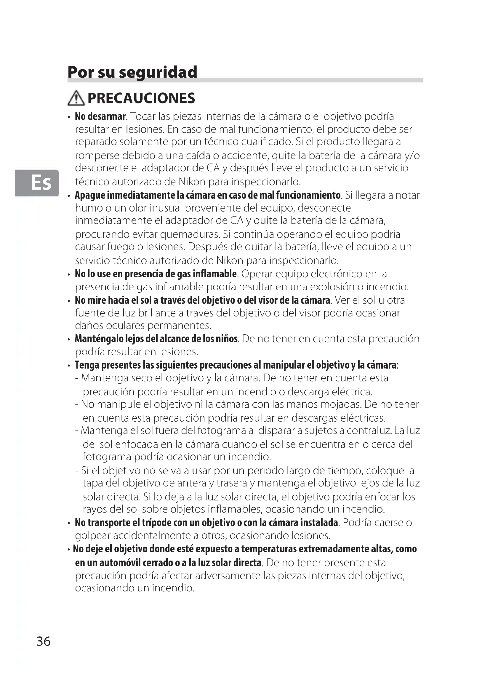- No desarmar. Tocar las piezas internas de la cámara o el objetivo podría resultar en lesiones. En caso de mal funcionamiento, el producto debe ser reparado solamente por un técnico cualificado. Si el producto llegara a romperse debido a una caída o accidente, quite la batería de la cámara y/o desconecte el adaptador de CA y después lleve el producto a un servicio técnico autorizado de Nikon para inspeccionarlo.
