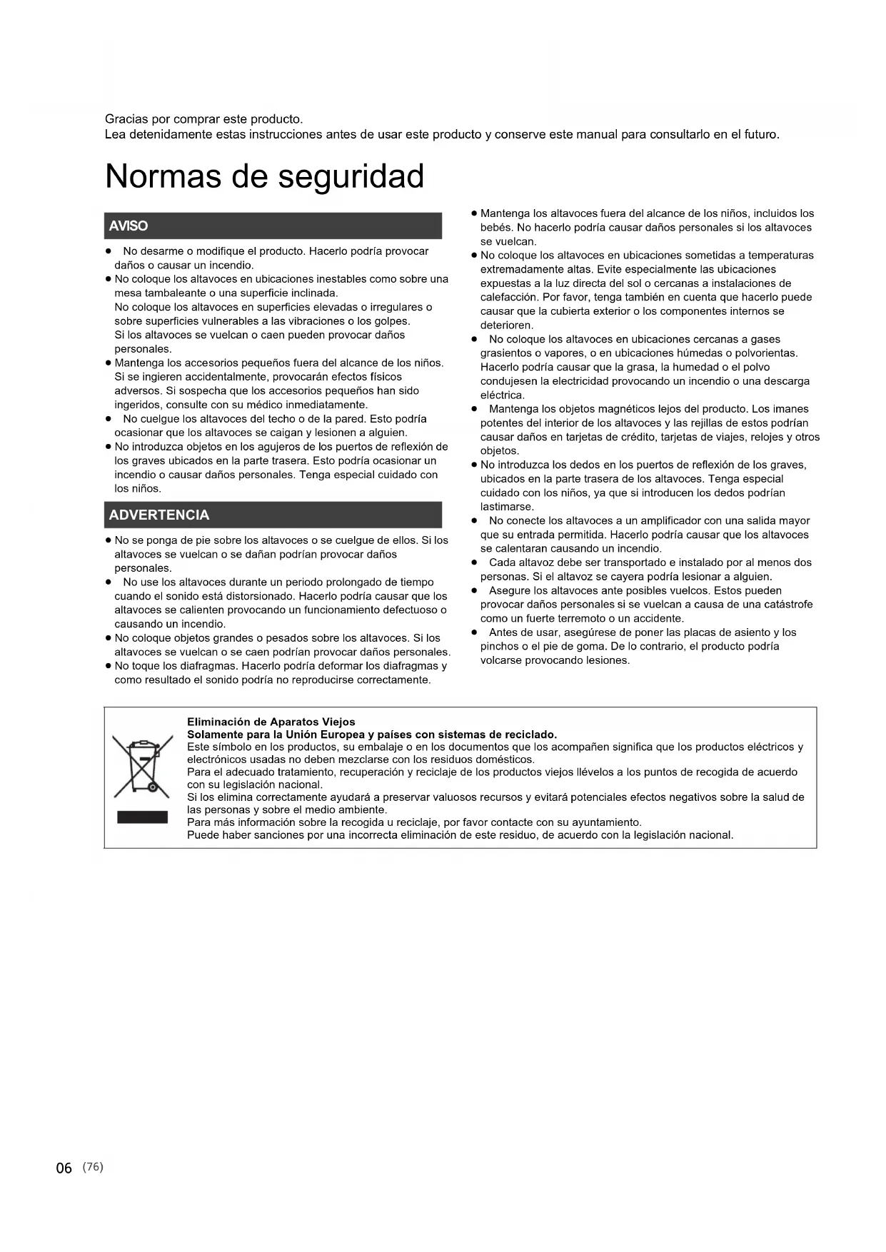 SB-G90_TQBM0081_PPCEBEGGN_mst.book 19 ページ 2017年2月10日 金曜日 午前10時39分Gracias por comprar este producto. Lea detenidamente estas instrucciones antes de usar este producto y conserve este manual para consultarlo en el futuro. Normas de seguridad ≥ No desarme o modifique el producto. Hacerlo podría provocar daños o causar un incendio. ≥ No coloque los altavoces en ubicaciones inestables como sobre una mesa tambaleante o una superficie inclinada. No coloque los altavoces en superficies elevadas o irregulares o sobre superficies vulnerables a las vibraciones o los golpes. Si los altavoces se vuelcan o caen pueden provocar daños personales. ≥ Mantenga los accesorios pequeños fuera del alcance de los niños. Si se ingieren accidentalmente, provocarán efectos físicos adversos. Si sospecha que los accesorios pequeños han sido ingeridos, consulte con su médico inmediatamente. ≥ No cuelgue los altavoces del techo o de la pared. Esto podría ocasionar que los altavoces se caigan y lesionen a alguien. ≥ No introduzca objetos en los agujeros de los puertos de reflexión de los graves ubicados en la parte trasera. Esto podría ocasionar un incendio o causar daños personales. Tenga especial cuidado con los niños. ≥ No se ponga de pie sobre los altavoces o se cuelgue de ellos. Si los altavoces se vuelcan o se dañan podrían provocar daños personales. ≥ No use los altavoces durante un periodo prolongado de tiempo cuando el sonido está distorsionado. Hacerlo podría causar que los altavoces se calienten provocando un funcionamiento defectuoso o causando un incendio. ≥ No coloque objetos grandes o pesados sobre los altavoces. Si los altavoces se vuelcan o se caen podrían provocar daños personales. ≥ No toque los diafragmas. Hacerlo podría deformar los diafragmas y como resultado el sonido podría no reproducirse correctamente. ≥ Mantenga los altavoces fuera del alcance de los niños, incluidos los bebés. No hacerlo podría causar daños personales si los altavoces se vuelcan. ≥ No coloque los altavoces en ubicaciones sometidas a temperaturas extremadamente altas. Evite especialmente las ubicaciones expuestas a la luz directa del sol o cercanas a instalaciones de calefacción. Por favor, tenga también en cuenta que hacerlo puede causar que la cubierta exterior o los componentes internos se deterioren. ≥ No coloque los altavoces en ubicaciones cercanas a gases grasientos o vapores, o en ubicaciones húmedas o polvorientas. Hacerlo podría causar que la grasa, la humedad o el polvo condujesen la electricidad provocando un incendio o una descarga eléctrica. ≥ Mantenga los objetos magnéticos lejos del producto. Los imanes potentes del interior de los altavoces y las rejillas de estos podrían causar daños en tarjetas de crédito, tarjetas de viajes, relojes y otros objetos. ≥ No introduzca los dedos en los puertos de reflexión de los graves, ubicados en la parte trasera de los altavoces. Tenga especial cuidado con los niños, ya que si introducen los dedos podrían lastimarse. ≥ No conecte los altavoces a un amplificador con una salida mayor que su entrada permitida. Hacerlo podría causar que los altavoces se calentaran causando un incendio. ≥ Cada altavoz debe ser transportado e instalado por al menos dos personas. Si el altavoz se cayera podría lesionar a alguien. ≥ Asegure los altavoces ante posibles vuelcos. Estos pueden provocar daños personales si se vuelcan a causa de una catástrofe como un fuerte terremoto o un accidente. ≥ Antes de usar, asegúrese de poner las placas de asiento y los pinchos o el pie de goma. De lo contrario, el producto podría volcarse provocando lesiones. AVISO ADVERTENCIA Eliminación de Aparatos Viejos Solamente para la Unión Europea y países con sistemas de reciclado. Este símbolo en los productos, su embalaje o en los documentos que los acompañen significa que los productos eléctricos y electrónicos usadas no deben mezclarse con los residuos domésticos. Para el adecuado tratamiento, recuperación y reciclaje de los productos viejos llévelos a los puntos de recogida de acuerdo con su legislación nacional. Si los elimina correctamente ayudará a preservar valuosos recursos y evitará potenciales efectos negativos sobre la salud de las personas y sobre el medio ambiente. Para más información sobre la recogida u reciclaje, por favor contacte con su ayuntamiento. Puede haber sanciones por una incorrecta eliminación de este residuo, de acuerdo con la legislación nacional.