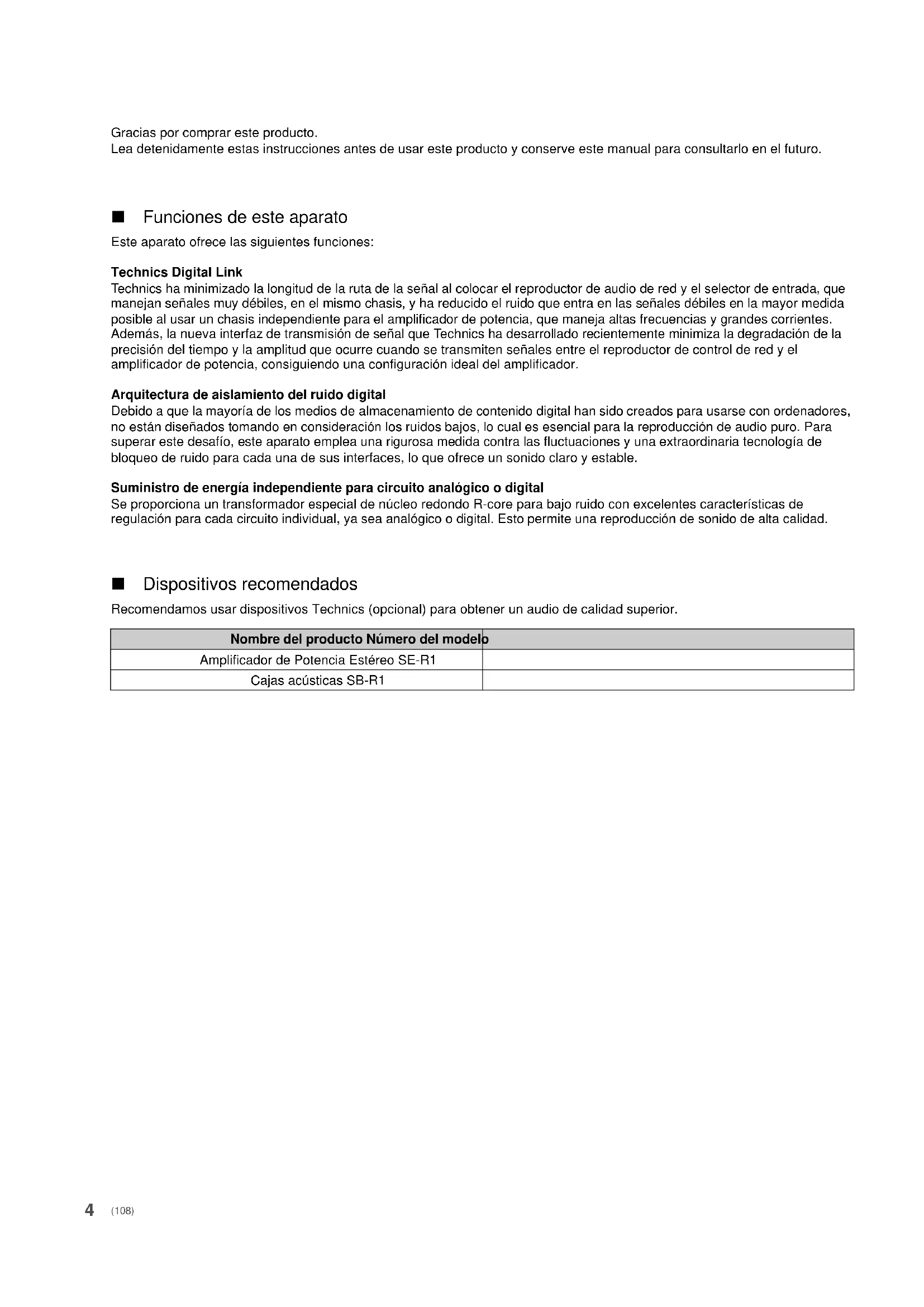 DAMAGES (INCLUDING, BUT NOT LIMITED TO, PROCUREMENT OF SUBSTITUTE GOODS OR SERVICES; LOSS OF USE, DATA, OR PROFITS; OR BUSINESS INTERRUPTION) HOWEVER CAUSED AND ON ANY THEORY OF LIABILITY, WHETHER IN CONTRACT, STRICT LIABILITY, OR TORT (INCLUDING NEGLIGENCE OR OTHERWISE) ARISING IN ANY WAY OUT OF THE USE OF THIS SOFTWARE, EVEN IF ADVISED OF THE POSSIBILITY OF SUCH DAMAGE. (107) SU-R1E-SQT0463_ita.book 29 ページ 2015年6月18日 木曜日 午前9時39分4 Gracias por comprar este producto. Lea detenidamente estas instrucciones antes de usar este producto y conserve este manual para consultarlo en el futuro. ∫ Funciones de este aparato Este aparato ofrece las siguientes funciones: Technics Digital Link Technics ha minimizado la longitud de la ruta de la señal al colocar el reproductor de audio de red y el selector de entrada, que manejan señales muy débiles, en el mismo chasis, y ha reducido el ruido que entra en las señales débiles en la mayor medida posible al usar un chasis independiente para el amplificador de potencia, que maneja altas frecuencias y grandes corrientes. Además, la nueva interfaz de transmisión de señal que Technics ha desarrollado recientemente minimiza la degradación de la precisión del tiempo y la amplitud que ocurre cuando se transmiten señales entre el reproductor de control de red y el amplificador de potencia, consiguiendo una configuración ideal del amplificador. Arquitectura de aislamiento del ruido digital Debido a que la mayoría de los medios de almacenamiento de contenido digital han sido creados para usarse con ordenadores, no están diseñados tomando en consideración los ruidos bajos, lo cual es esencial para la reproducción de audio puro. Para superar este desafío, este aparato emplea una rigurosa medida contra las fluctuaciones y una extraordinaria tecnología de bloqueo de ruido para cada una de sus interfaces, lo que ofrece un sonido claro y estable. Suministro de energía independiente para circuito analógico o digital Se proporciona un transformador especial de núcleo redondo R-core para bajo ruido con excelentes características de regulación para cada circuito individual, ya sea analógico o digital. Esto permite una reproducción de sonido de alta calidad. ∫ Dispositivos recomendados Recomendamos usar dispositivos Technics (opcional) para obtener un audio de calidad superior. Nombre del producto Número del modelo Amplificador de Potencia Estéreo SE-R1 Cajas acústicas SB-R1 (108) SU-R1E-SQT0463_spa.book 4 ページ 2015年6月18日 木曜日 午前10時23分5 Español Normas de seguridad Unidad ≥ Para reducir el riesgo de incendio, descarga eléctrica o daño del producto,– No exponga esta unidad a la lluvia, humedad, goteo ni salpicaduras.– No coloque objetos llenos con líquidos, como floreros, sobre esta unidad.– Use solamente los accesorios recomendados.– No saque las cubiertas.– No repare esta unidad usted mismo. Consulte al personal de servicio calificado para la reparación.– No permita que objetos de metal caigan dentro de esta unidad.– No ponga objetos pesados en esta unidad. Cable de alimentación de CA ≥ Para reducir el riesgo de incendio, descarga eléctrica o daño del producto,– Asegúrese de que el voltaje de alimentación corresponda al voltaje impreso en esta unidad.– Inserte por completo el enchufe del cable de alimentación en la toma de CA.– No tire, doble o coloque elementos pesados sobre el cable de alimentación.– No manipule el enchufe con las manos mojadas.– Agarre el cuerpo del enchufe del cable de alimentación al desconectar el enchufe.– No use un enchufe del cable de alimentación o toma de CA dañado.≥ El enchufe de conexión a la red eléctrica es el dispositivo de desconexión.Instale esta unidad de forma que el enchufe de conexión a la red eléctrica pueda desenchufarse de la toma de forma inmediata. Unidad ≥ No coloque objetos con llama descubierta, una vela por ejemplo, encima de la unidad.≥ Esta unidad puede tener interferencias de radio causadas por teléfonos móviles durante su utilización. Si tales interferencias resultan evidentes, aumente la separación entre la unidad y el teléfono móvil.≥ Esta unidad se diseñó para ser utilizada en climas tropicales. Ubicación ≥ Coloque esta unidad sobre una superficie pareja.≥ Para reducir el riesgo de incendio, descarga eléctrica o daño del producto,– Para mantener bien ventilada esta unidad, no la instale ni ponga en un estante de libros, mueble empotrado u otro espacio de dimensiones reducidas.– No obstruya las aberturas de ventilación de la unidad con periódicos, manteles, cortinas u objetos similares.– No exponga esta unidad a la luz solar directa, altas temperaturas, mucha humedad y vibración excesiva.≥ No eleve o transporte este aparato sosteniéndolo por alguna de sus perillas. De hacerlo, el aparato podría caerse y causar lesiones personales o un funcionamiento defectuoso de este aparato. Pila ≥ Existe un daño de explosión si la batería no se reemplaza correctamente. Reemplace sólo con el tipo recomendado por el fabricante.≥ La mala manipulación de las baterías puede causar una pérdida de electrolito y puede causar un incendio.– Retire la batería si piensa no usar el mando a distancia durante un período largo de tiempo. Almacene en lugares oscuros y frescos.– No caliente ni exponga las pilas a las llamas.– No deje la(s) batería(s) en un automóvil expuesto a la luz solar directa por un período prolongado de tiempo con las puertas y ventanas cerradas.– No las desarme ni coloque en cortocircuito.– No intente recargar baterías alcalinas o de manganeso.– No utilice baterías si se ha pelado la cubierta.– No mezcle baterías usadas y nuevas o diferentes tipos de baterías al mismo tiempo.≥ Al desechar las baterías, comuníquese con sus autoridades locales o distribuidores y pregunte por el método de eliminación correcto. AVISO ADVERTENCIA El