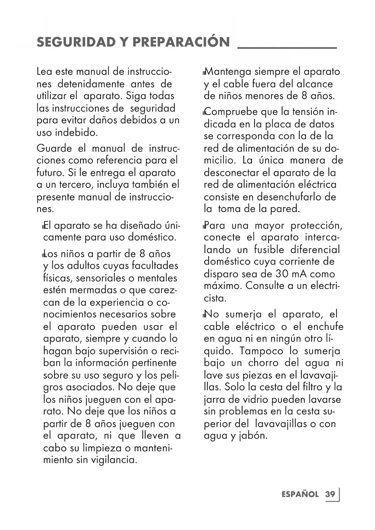 No sumerja el aparato, el cable eléctrico o el enchufe en agua ni en ningún otro lí- quido. Tampoco lo sumerja bajo un chorro del agua ni lave sus piezas en el lavavaji- llas. Solo la cesta del filtro y la jarra de vidrio pueden lavarse sin problemas en la cesta su- perior del lavavajillas o con agua y jabón.40 ESPAÑOL