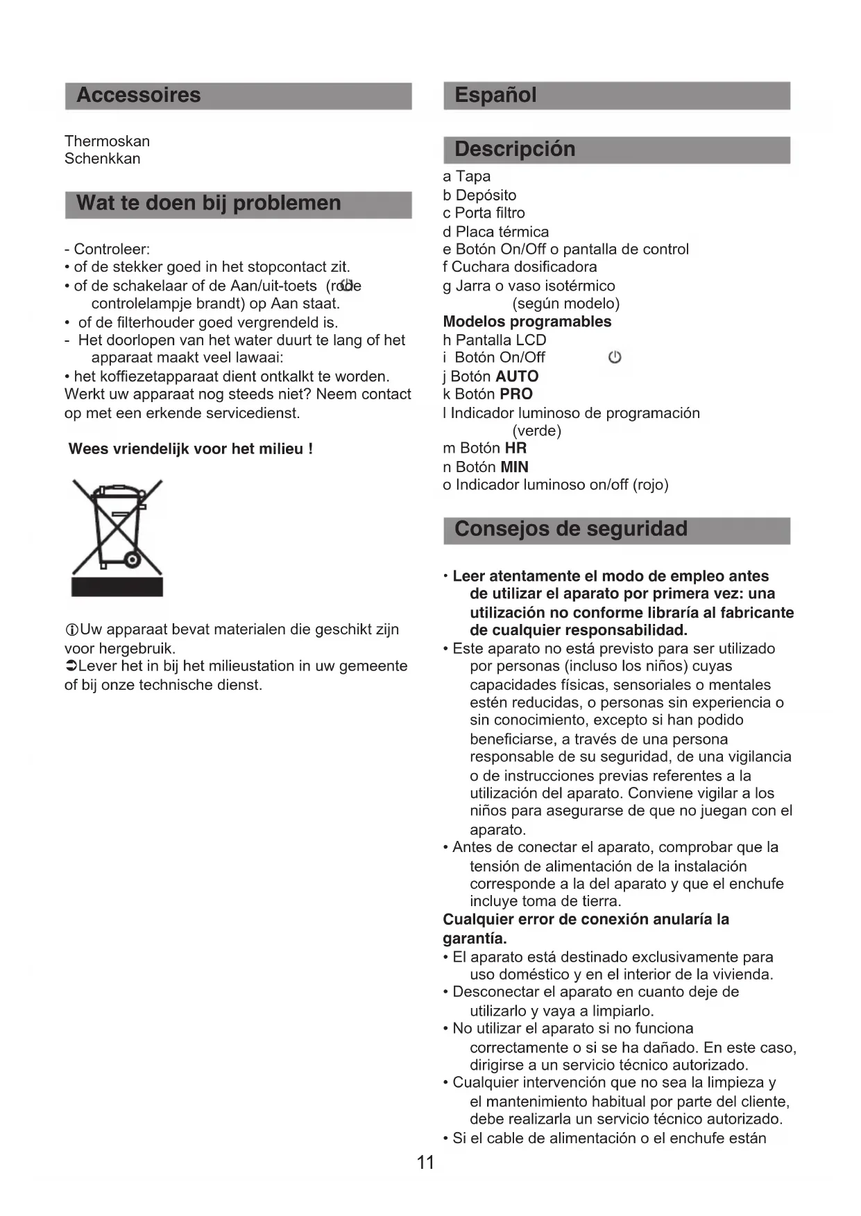 - Si el cable de alimentación o el enchufe están Español Descripción Consejos de seguridad Wat te doen bij problemen Accessoires cafetière CM 823 EU11 :cafetière CM 823 16/11/10 11:17 Page1112 dañados, no utilice el aparato. Para evitar cualquier peligro, lleve a remplazar el cable de alimentación a un servicio técnico autorizado.