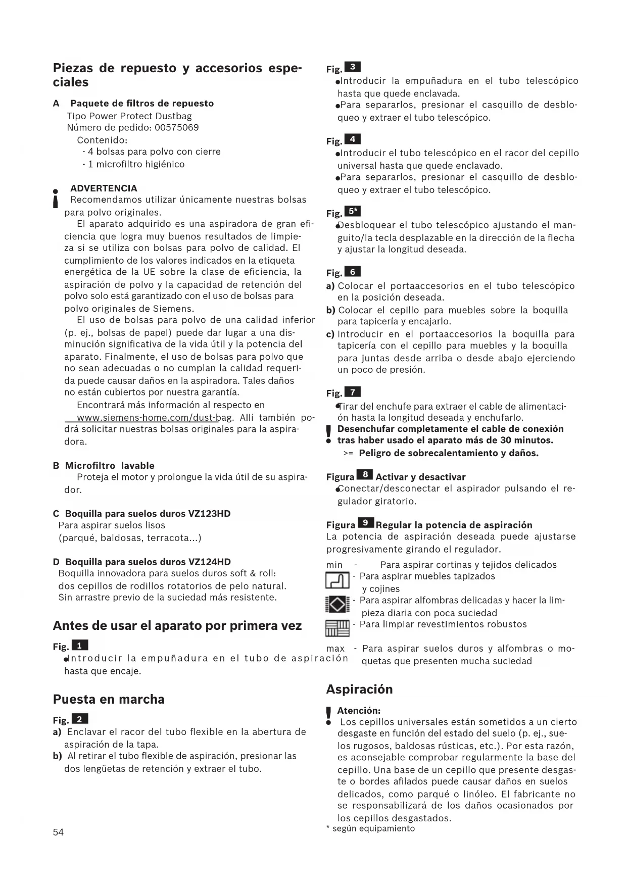 ADVERTENCIA Recomendamos utilizar únicamente nuestras bolsas para polvo originales. El aparato adquirido es una aspiradora de gran efi- ciencia que logra muy buenos resultados de limpie- za si se utiliza con bolsas para polvo de calidad. El cumplimiento de los valores indicados en la etiqueta energética de la UE sobre la clase de eficiencia, la aspiración de polvo y la capacidad de retención del polvo solo está garantizado con el uso de bolsas para polvo originales de Siemens. El uso de bolsas para polvo de una calidad inferior (p. ej., bolsas de papel) puede dar lugar a una dis- minución significativa de la vida útil y la potencia del aparato. Finalmente, el uso de bolsas para polvo que no sean adecuadas o no cumplan la calidad requeri- da puede causar daños en la aspiradora. Tales daños no están cubiertos por nuestra garantía. Encontrará más información al respecto en www.siemens-home.com/dust-bag. Allí también po- drá solicitar nuestras bolsas originales para la aspira- dora. B Microfiltro lavable Proteja el motor y prolongue la vida útil de su aspira- dor. C Boquilla para suelos duros VZ123HD Para aspirar suelos lisos (parqué, baldosas, terracota...) D Boquilla para suelos duros VZ124HD Boquilla innovadora para suelos duros soft & roll: dos cepillos de rodillos rotatorios de pelo natural. Sin arrastre previo de la suciedad más resistente. Antes de usar el aparato por primera vez Fig.