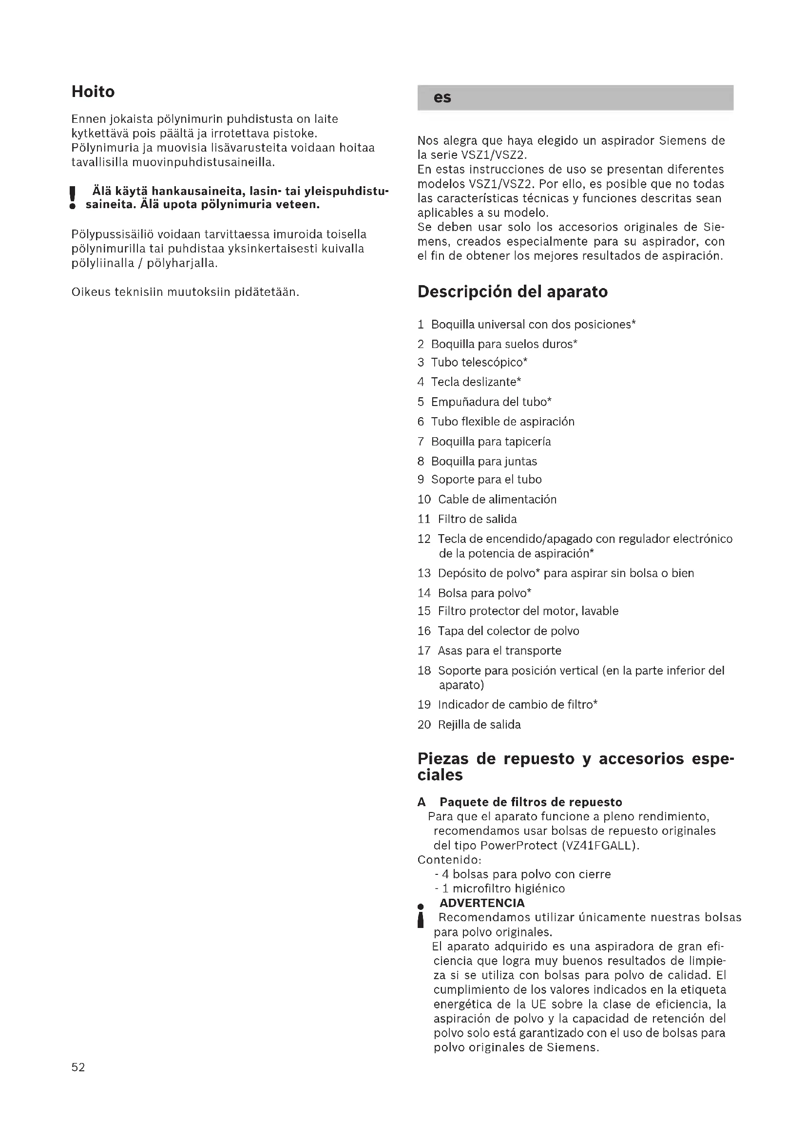 Nos alegra que haya elegido un aspirador Siemens de la serie VSZ1/VSZ2. En estas instrucciones de uso se presentan diferentes modelos VSZ1/VSZ2. Por ello, es posible que no todas las características técnicas y funciones descritas sean aplicables a su modelo. Se deben usar solo los accesorios originales de Sie- mens, creados especialmente para su aspirador, con el fin de obtener los mejores resultados de aspiración. Descripción del aparato 1 Boquilla universal con dos posiciones* 2 Boquilla para suelos duros* 3 Tubo telescópico* 4 Tecla deslizante* 5 Empuñadura del tubo* 6 Tubo flexible de aspiración 7 Boquilla para tapicería 8 Boquilla para juntas 9 Soporte para el tubo 10 Cable de alimentación 11 Filtro de salida 12 Tecla de encendido/apagado con regulador electrónico de la potencia de aspiración* 13 Depósito de polvo* para aspirar sin bolsa o bien 14 Bolsa para polvo* 15 Filtro protector del motor, lavable 16 Tapa del colector de polvo 17 Asas para el transporte 18 Soporte para posición vertical (en la parte inferior del aparato) 19 Indicador de cambio de filtro* 20 Rejilla de salida Piezas de repuesto y accesorios espe- ciales A Paquete de filtros de repuesto Para que el aparato funcione a pleno rendimiento, recomendamos usar bolsas de repuesto originales del tipo PowerProtect (VZ41FGALL). Contenido: - 4 bolsas para polvo con cierre - 1 microfiltro higiénico