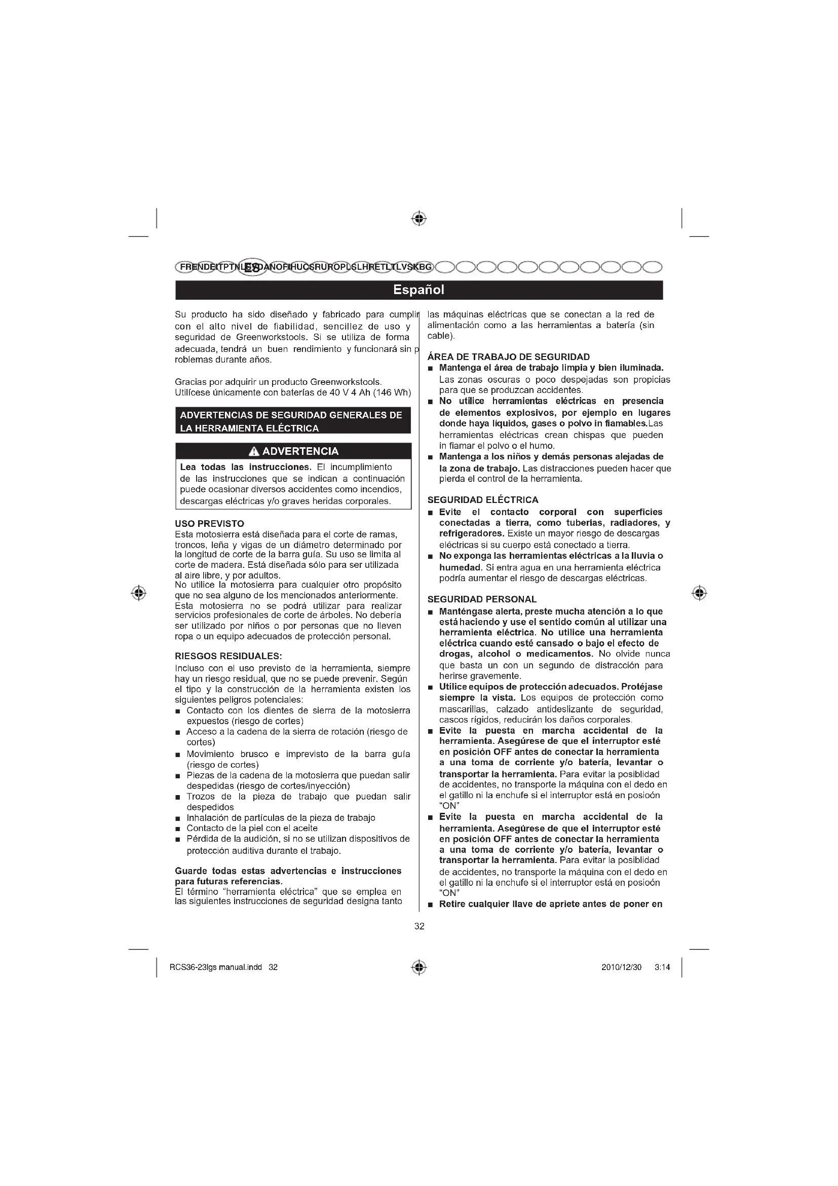 FR EN DE IT PT NL SV DA NO FI HU CS RU RO PL SL HR ET LT LV SK BG Su producto ha sido diseñado y fabricado para cumplir con el alto nivel de fiabilidad, sencillez de uso y seguridad de Greenworkstools. Si se utiliza de forma adecuada, tendrá un buen rendimiento y funcionará sin p roblemas durante años. Gracias por adquirir un producto Greenworkstools. Utilícese únicamente con baterías de 40 V 4 Ah (146 Wh)